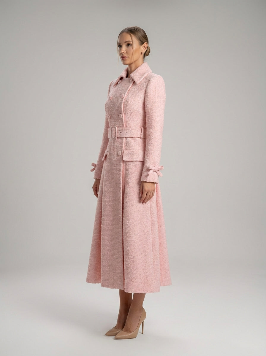 שמלת מעיל טוויד מרגו היא שמלת מידי ורודה עם חזה כפול, מותן חגורה, בד טוויד בעל טקסטורה ותפירה מעודנת.