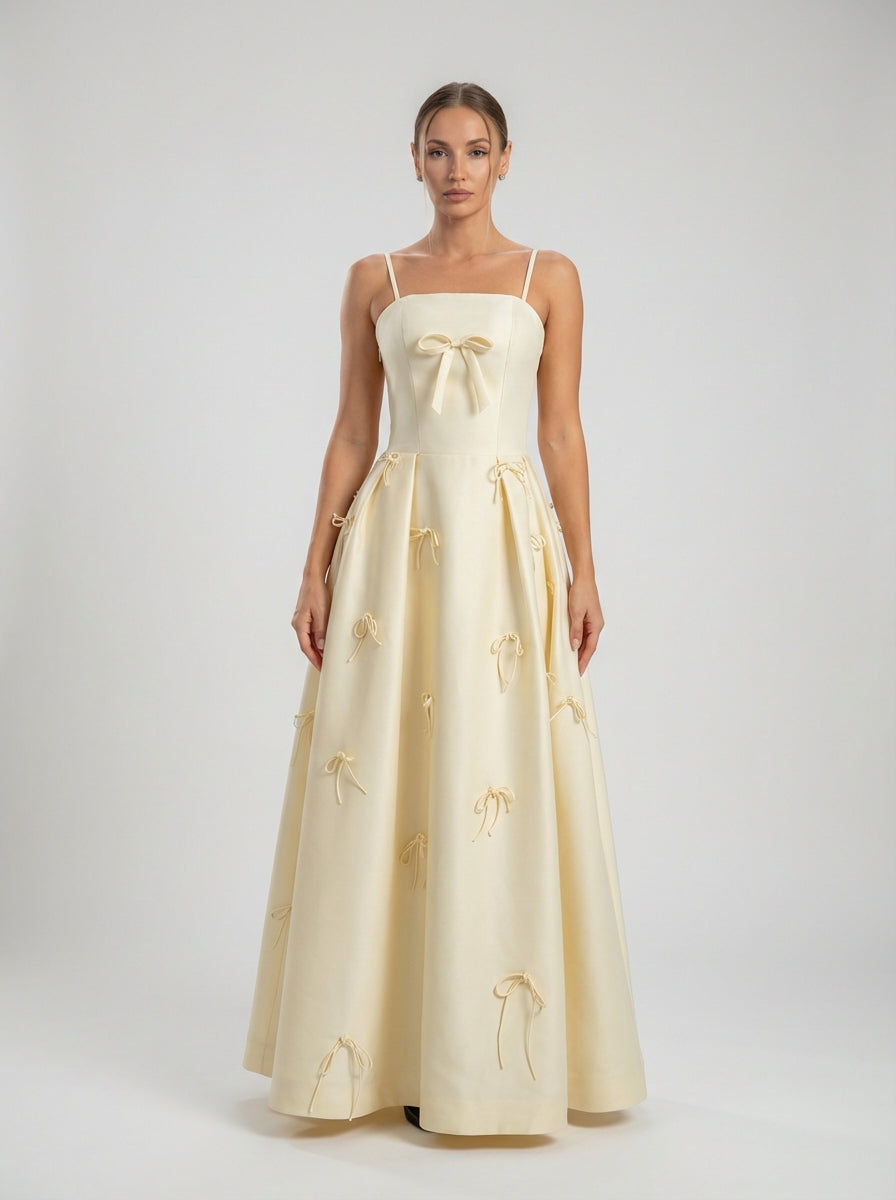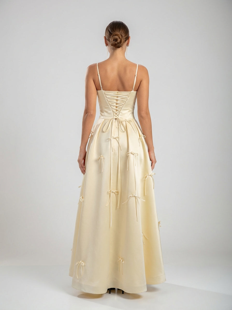 שמלת קולט מעוטרת בקשת היא שמלה בצבע שנהב באורך הרצפה עם רצועות עדינות, מחוך מובנה ופריטי קשת מפוזרים.