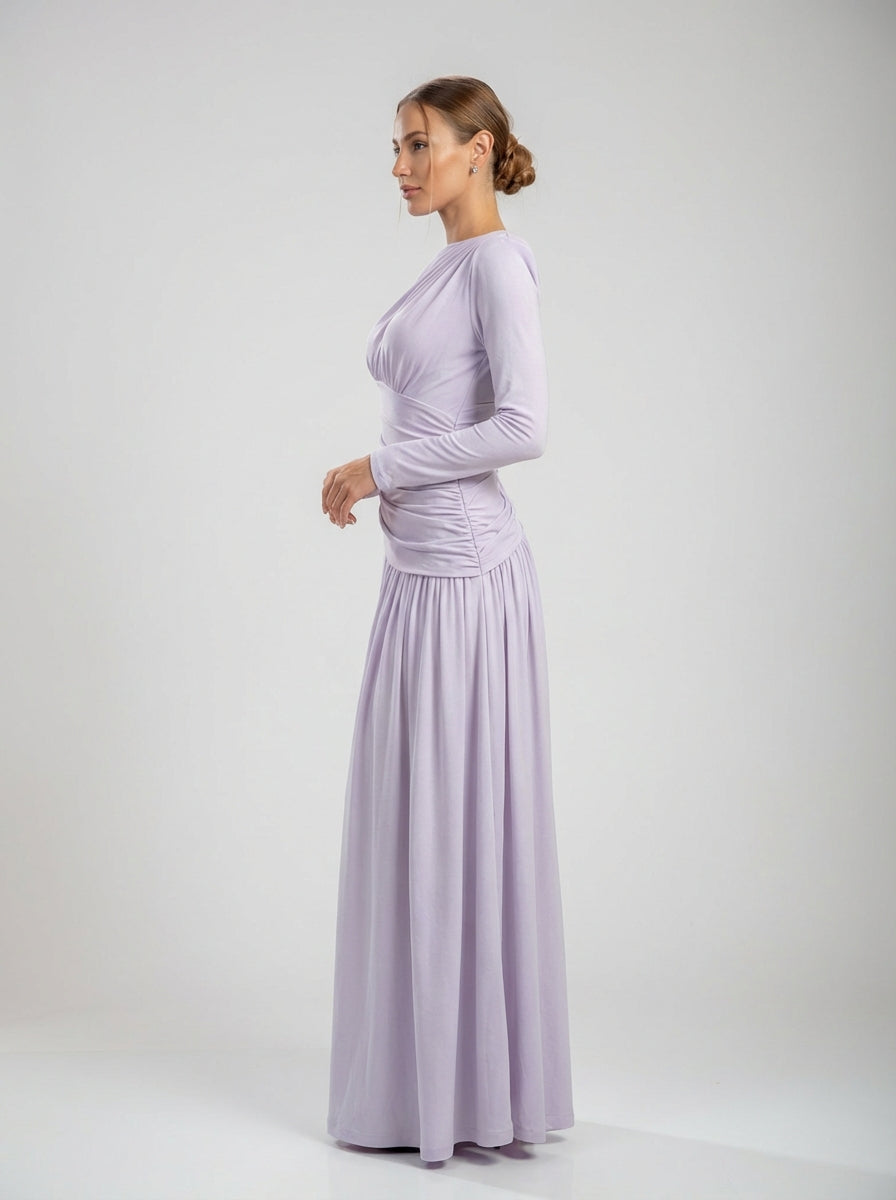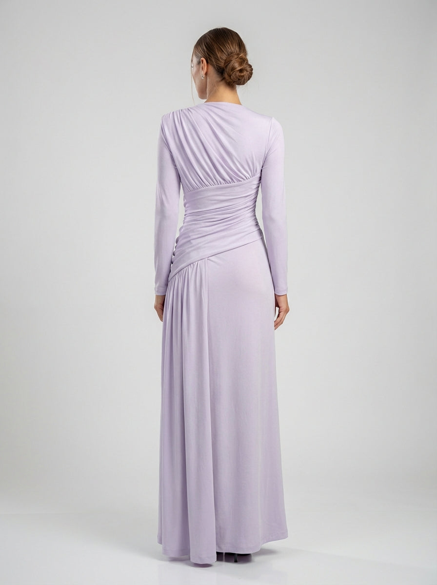 שמלה רשמית ארוכת שרוולים זו בצבע לילך, עשויה מג'רזי נמתח חלק בגימור מט, וכוללת צווארון א-סימטרי נמתח באלכסון על פני המחוך, ויוצר תנועה ויזואלית דינמית תוך מסגרת עצם הבריח בתחכום מאופק. קפלים מדויקים במותניים מחטבים ומגדירים את הצללית, ומדגישים את הקימורים הטבעיים מבלי להתפשר על נוחות.