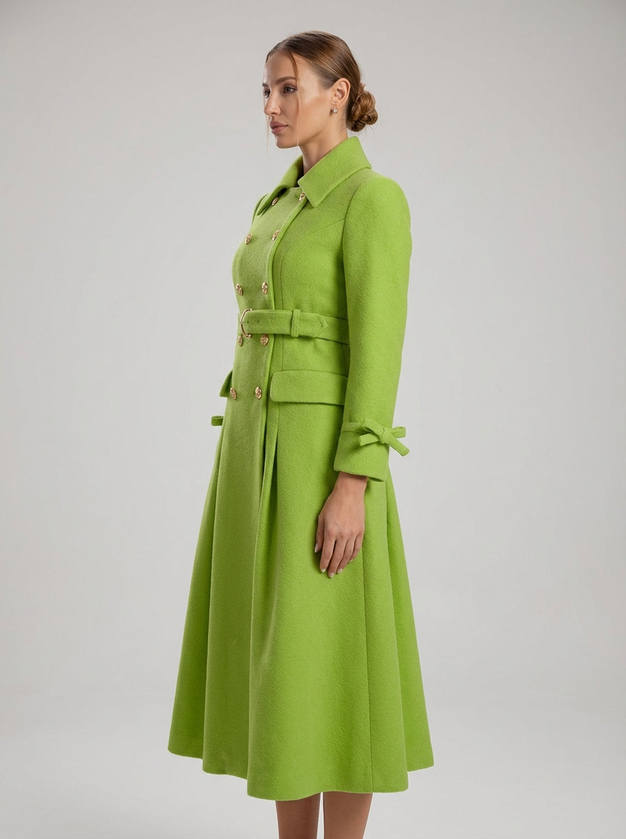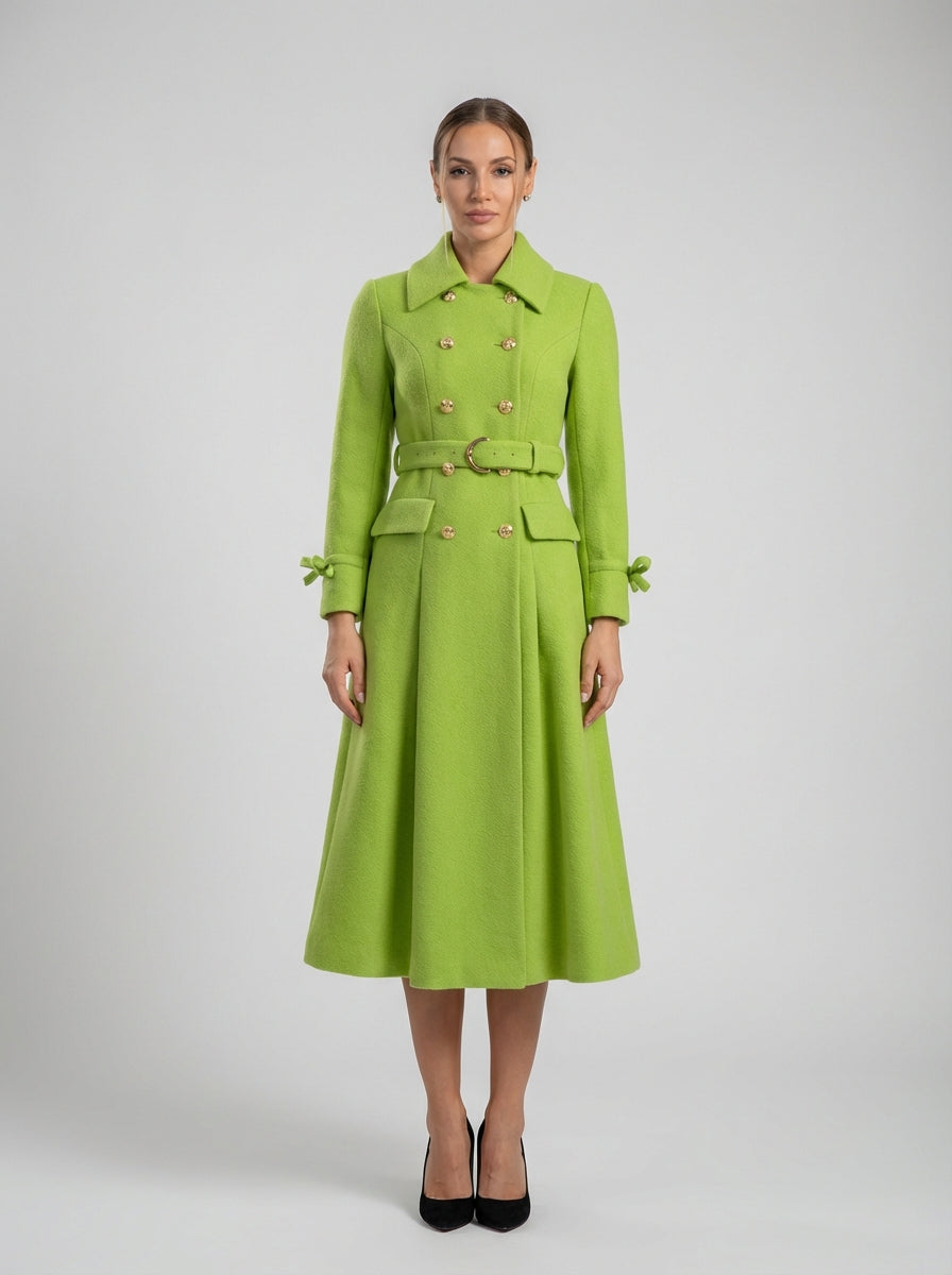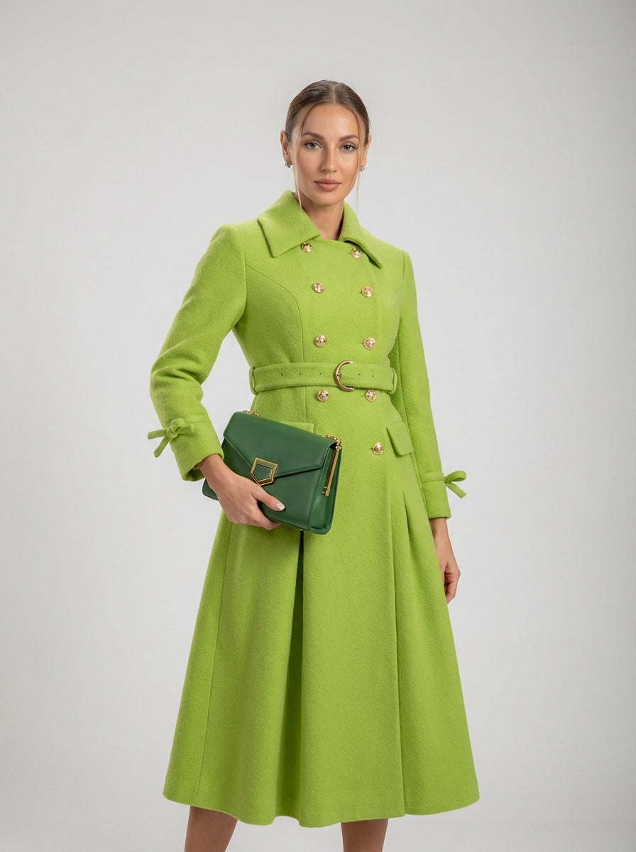 שמלת המעיל החגורה של ויויאן היא ביטוי נועז של חייטות מודרנית, שעוצבה למשוך תשומת לב באמצעות צבע, מבנה ודיוק. גזרה זו באורך מידי, המעוצבת בגוון ירוק רענן עז, משלבת מבנה מעיל קלאסי עם אלגנטיות נשית למראה שמרגיש עוצמתי אך מעודן.