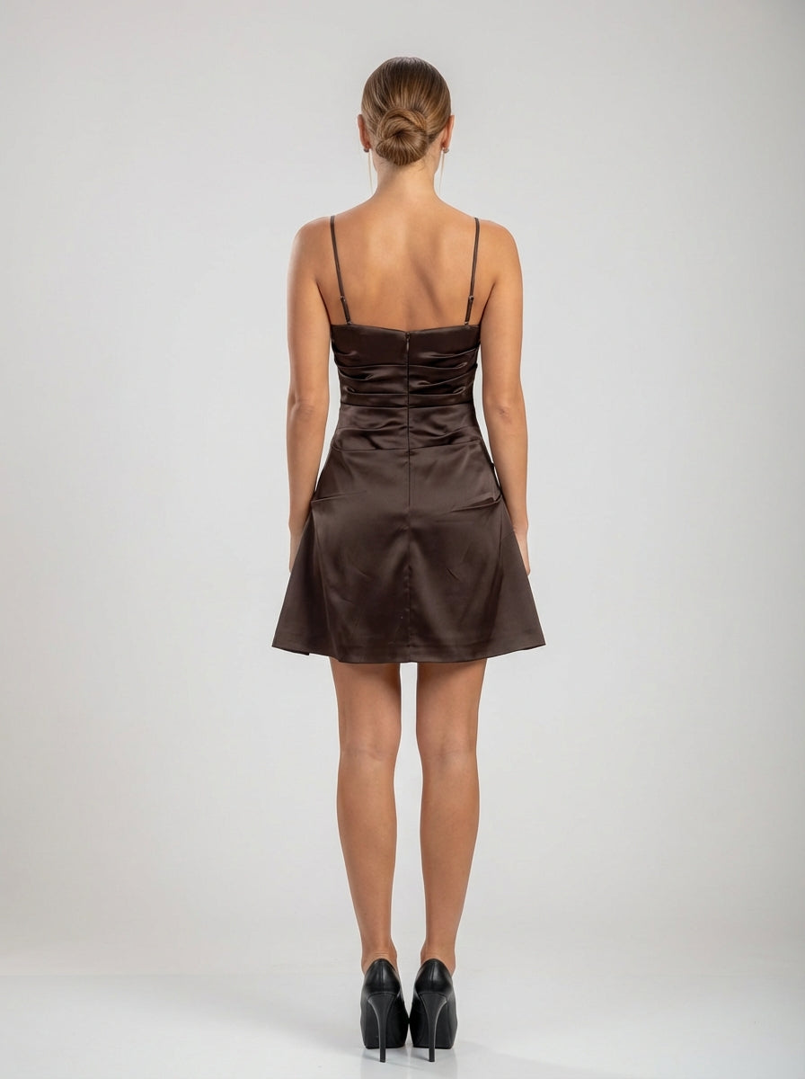 שמלת מיני סאטן קולט היא שמלת מיני סאטן בצבע חום שוקולד הכוללת רצועות עדינות, מחוך מקושט וחצאית א-סימטרית דקה.
