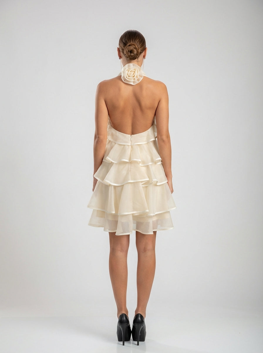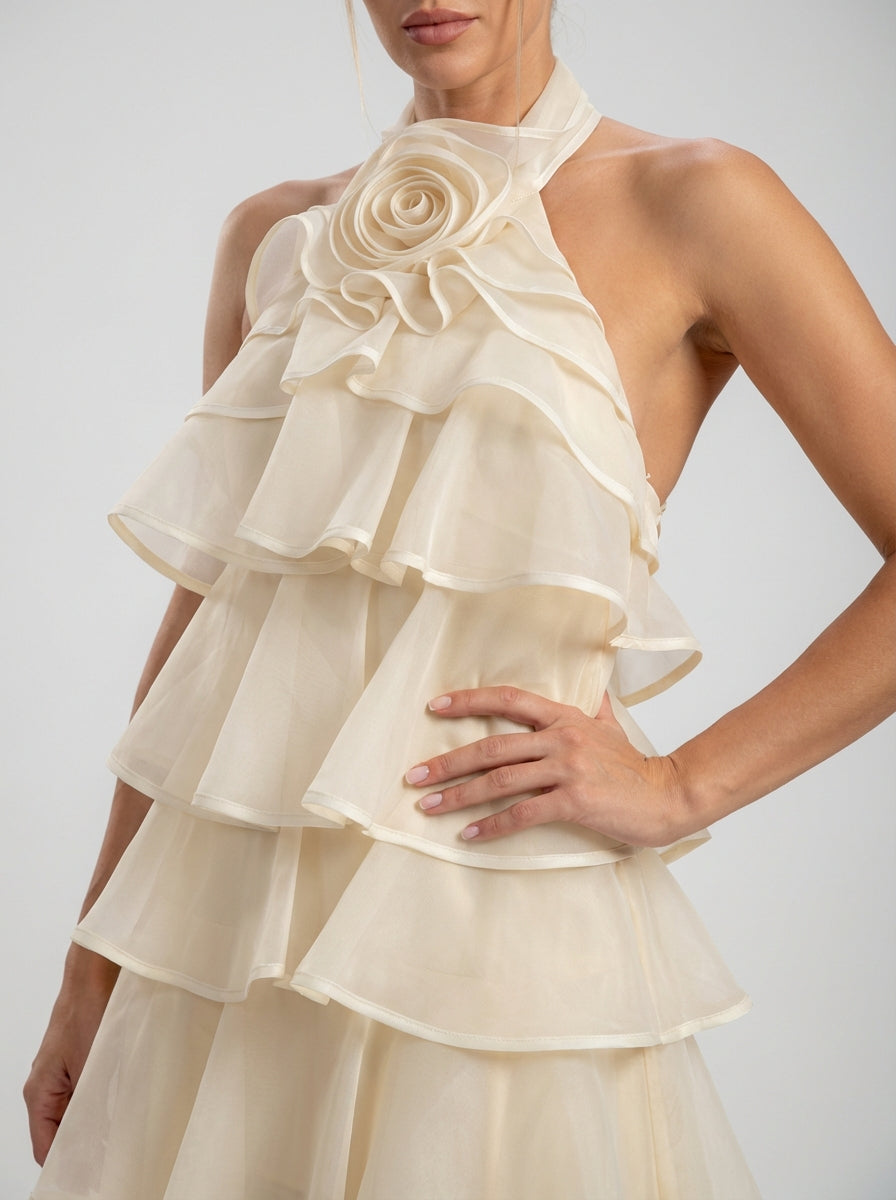 שמלת קוקטייל בסגנון הלטר עשויה מאורגנזה קלילה בעלת מבנה, וכוללת שכבות מדורגות היוצרות נפח דרמטי תוך שמירה על איזון מעודן. צווארון הצוואר מעוטר בפירוט ורדים מפוסלים במיוחד - נקודת מוקד פרחונית נועזת המעלה את כל הצללית מרומנטית לאייקונית.