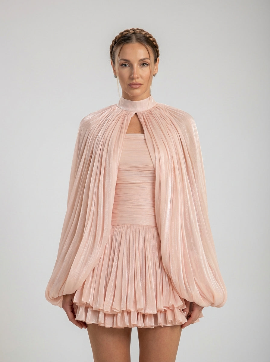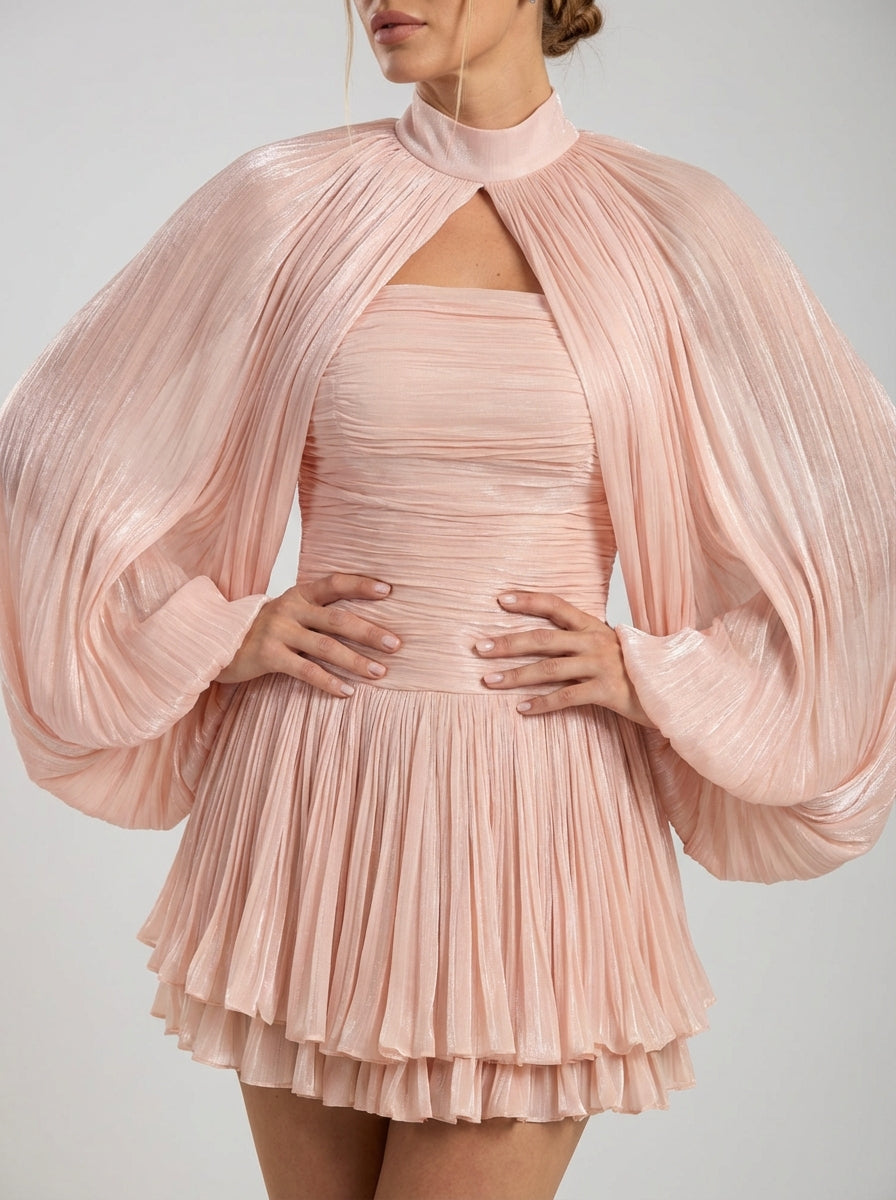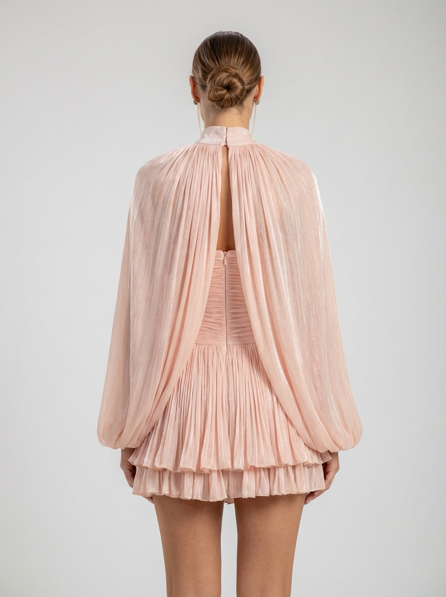 האמירה המגדירה טמונה בשרוולי השמלה הנפחיים - פאנלים שיפון קפלים זורמים הנשפכים מהצווארון הגבוה ונופלים לתנועה אוורירית וגלויה. שרוולים דרמטיים אלה יוצרים צללית מלכותית, והופכים שמלת מיני לרגע טקסי.