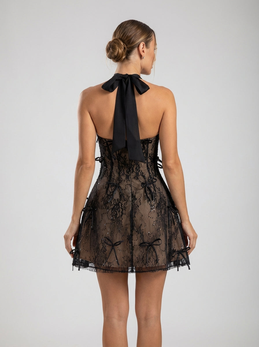 שמלת מיני שחורה בגזרת הלטר עם פפיון היא שילוב מרשים של אלגנטיות חושנית ונשיות מודרנית. שמלה זו, המעוצבת עם צווארון קולר מחמיא, מדגישה את הכתפיים והמחשוף תוך שהיא מציעה גזרה מעוצבת להפליא לאורך המחוך. שכבת התחרה השקופה מעוטרת בעדינות בנצנצים עדינים, המוסיפה נצנוץ מעודן שלוכד את האור מבלי להשתלט על המראה.
