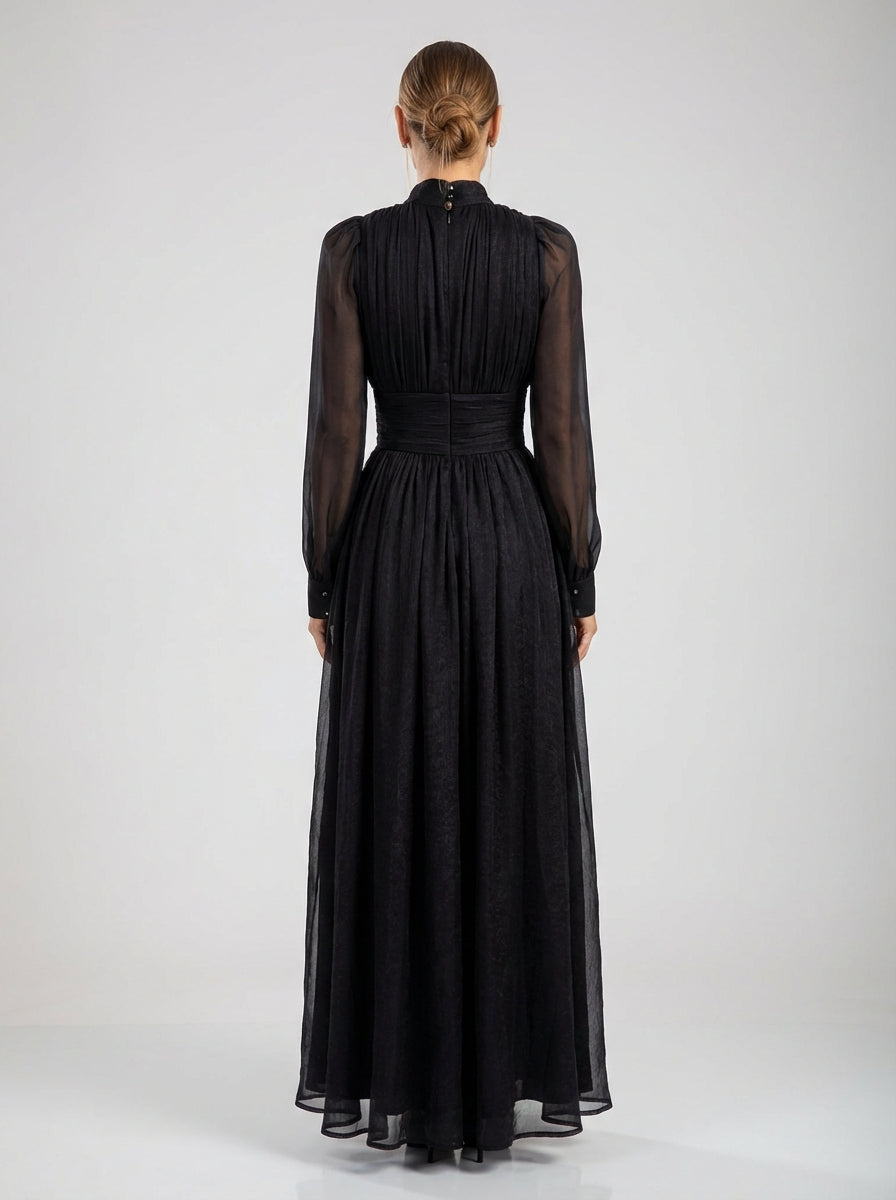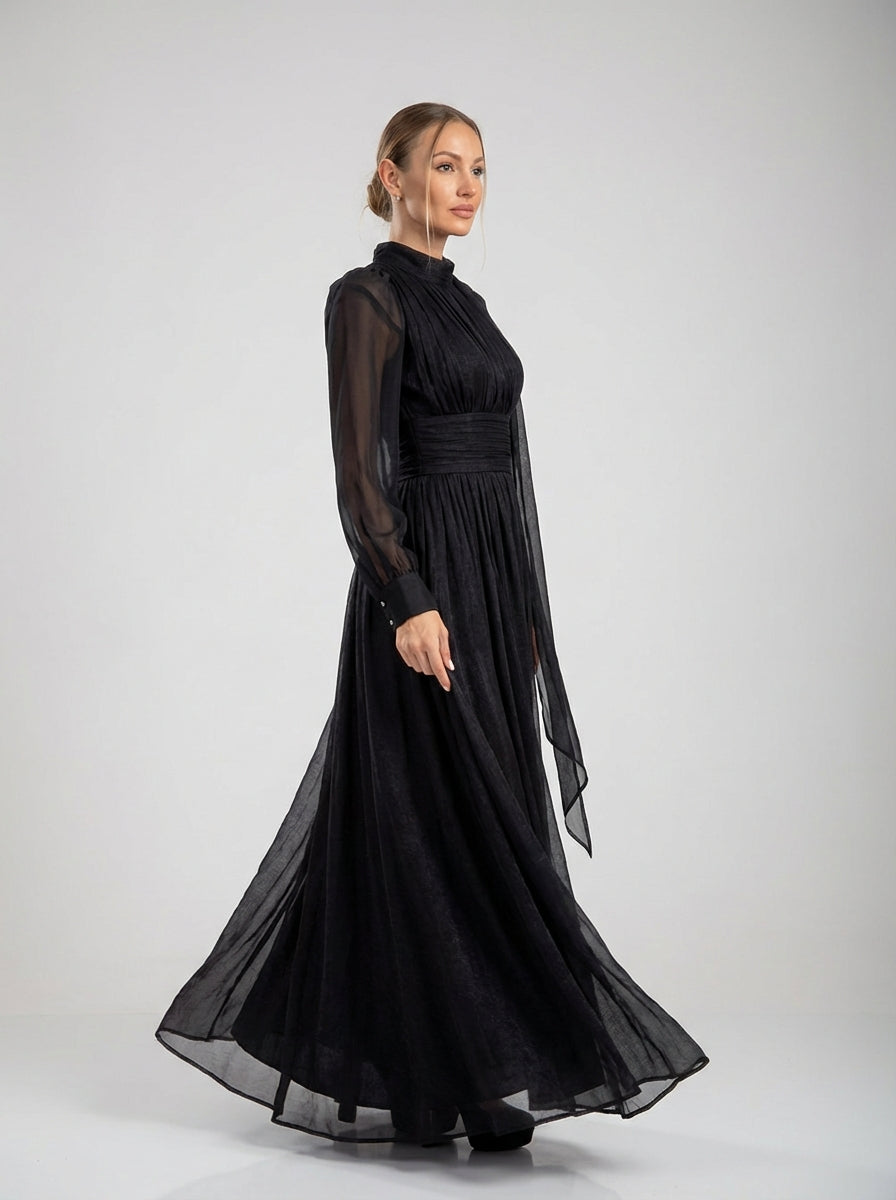 שמלת מקסי שחורה שקופה עם שרוולים ארוכים, צווארון גבוה וחצאית זורמת, מעוצבת לתנועה אלגנטית ותחכום נצחי באירועים רשמיים.