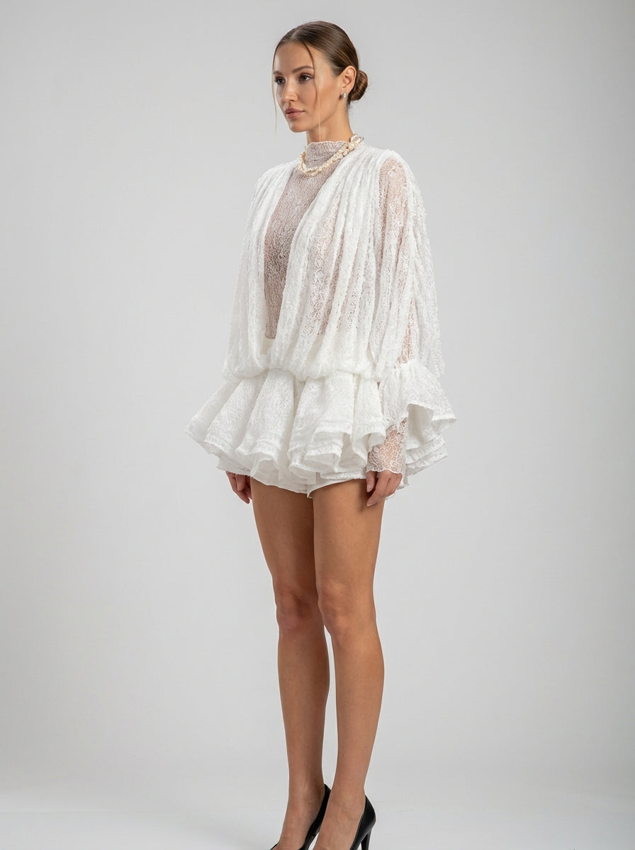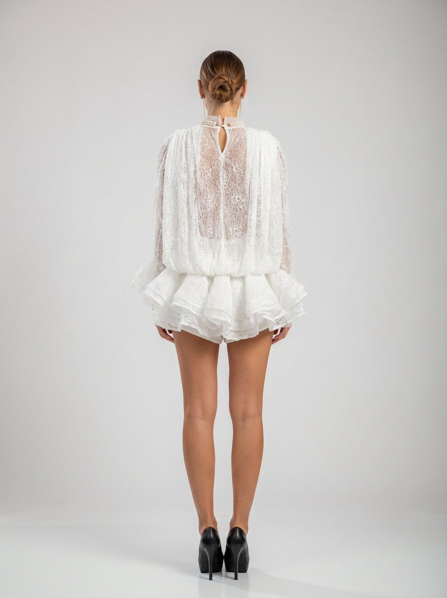 The mini skirt is finished with layered ruffle detailing that adds movement, volume, and a playful edge. Designed to stand out, this lace mini dress is perfect for special occasions, bridal events, fashion-forward parties, and elevated evening wear. Refined yet bold, it’s a statement piece that embodies contemporary elegance.