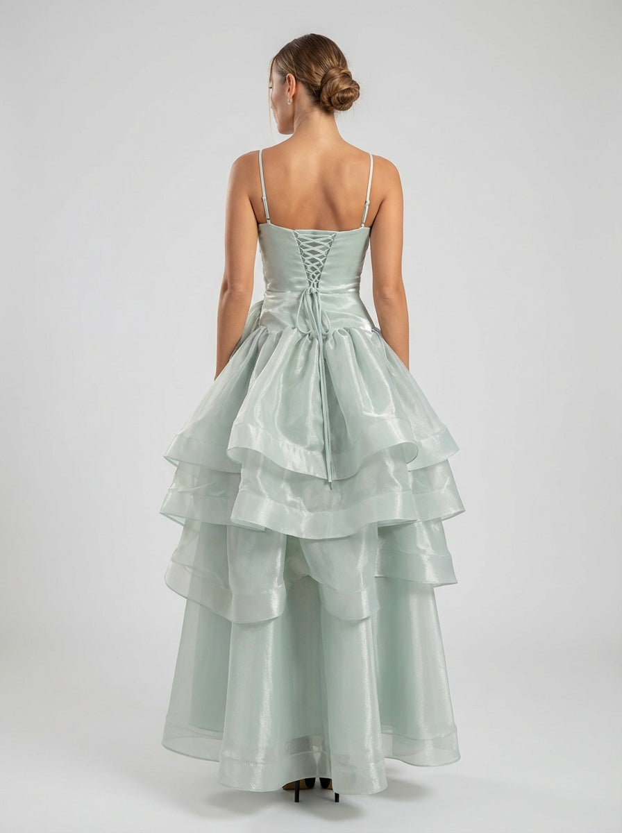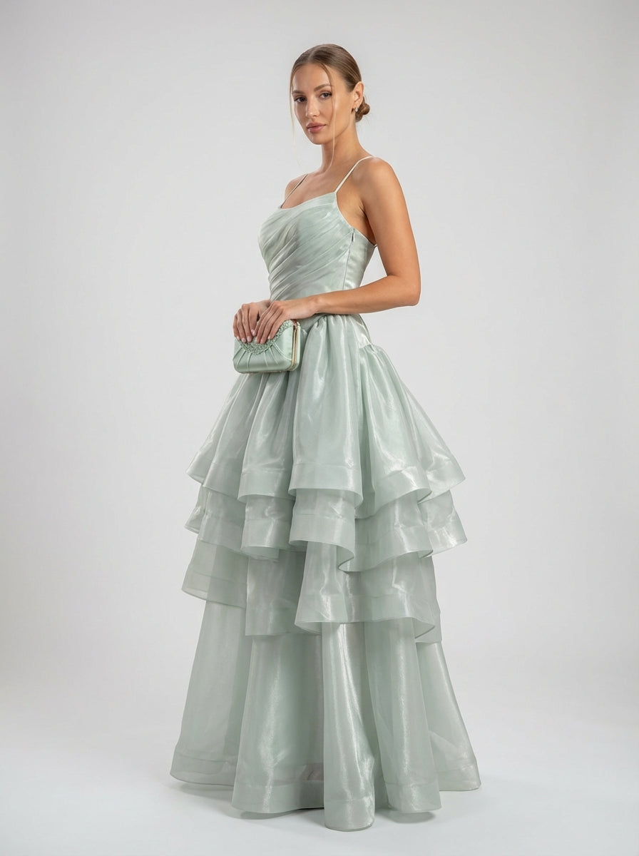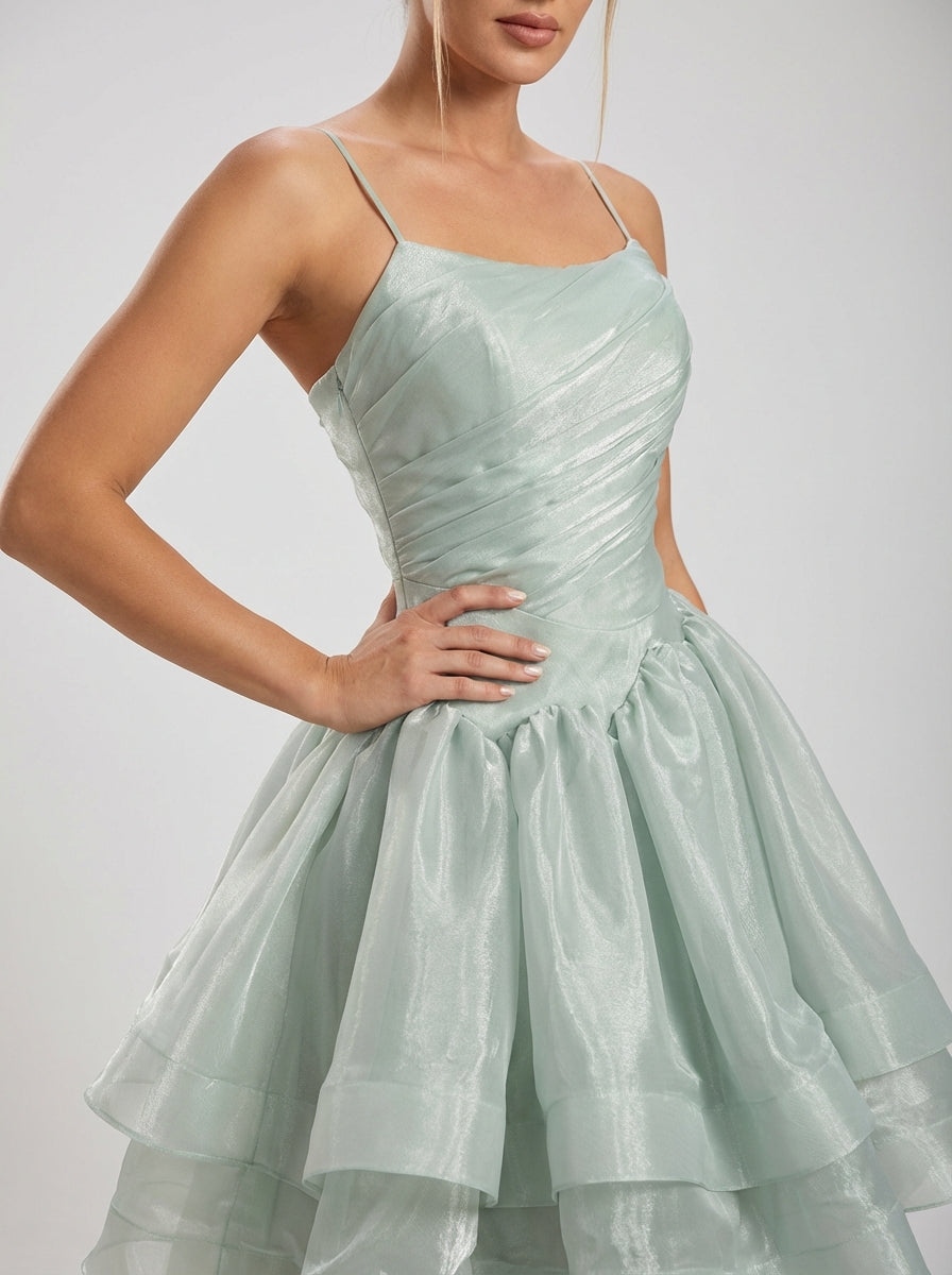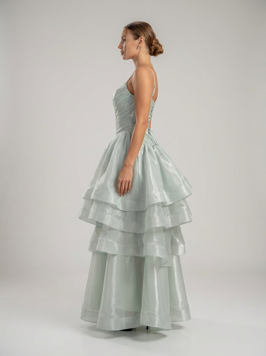 שמלת שמלה ללא כתפיות בצבע מנטה עם מחוך קפלים וחצאית אורגנזה מדורגת.