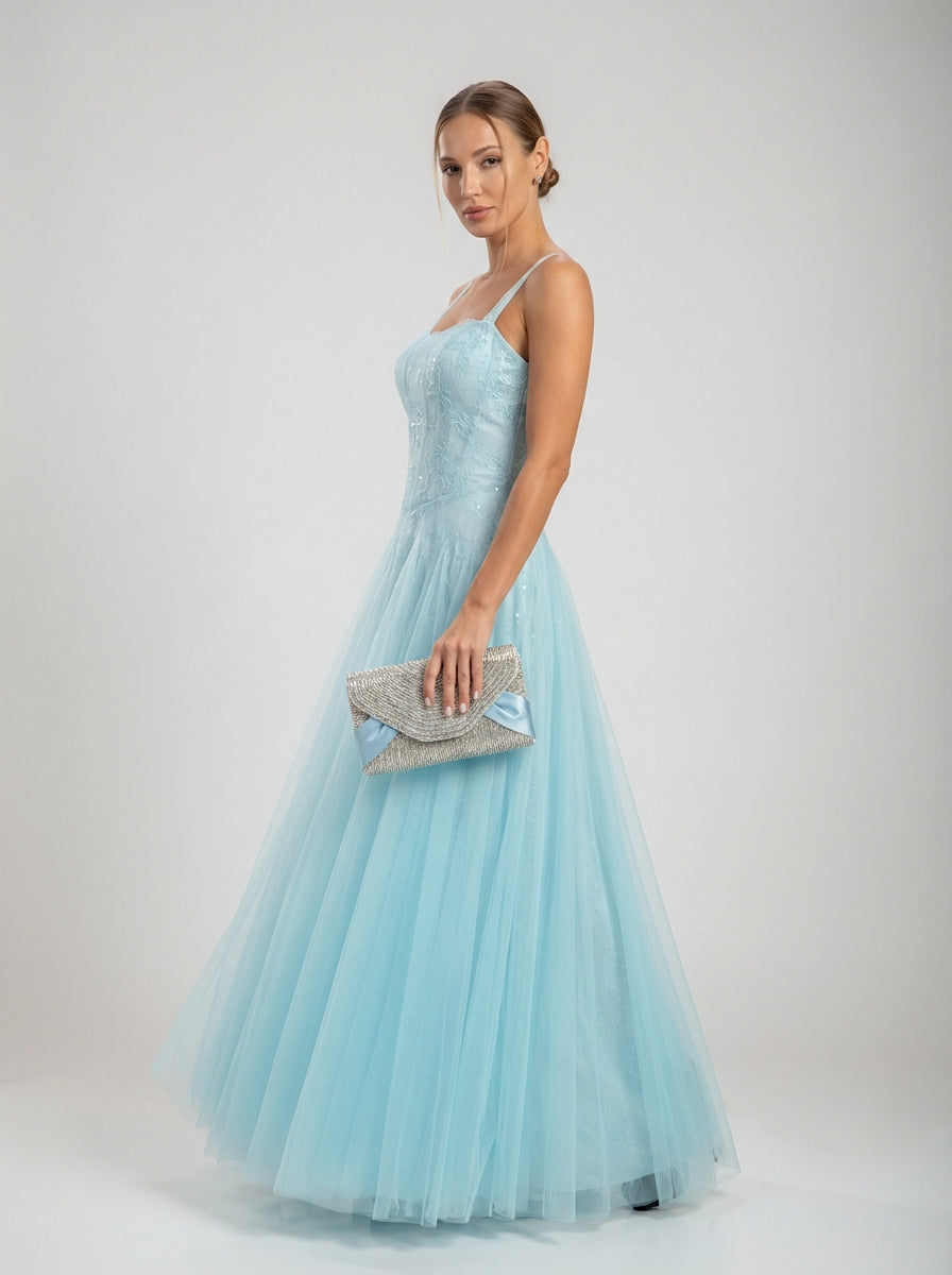 שמלה בצבע תכלת עם מחוך צמוד וחצאית טול זורמת.