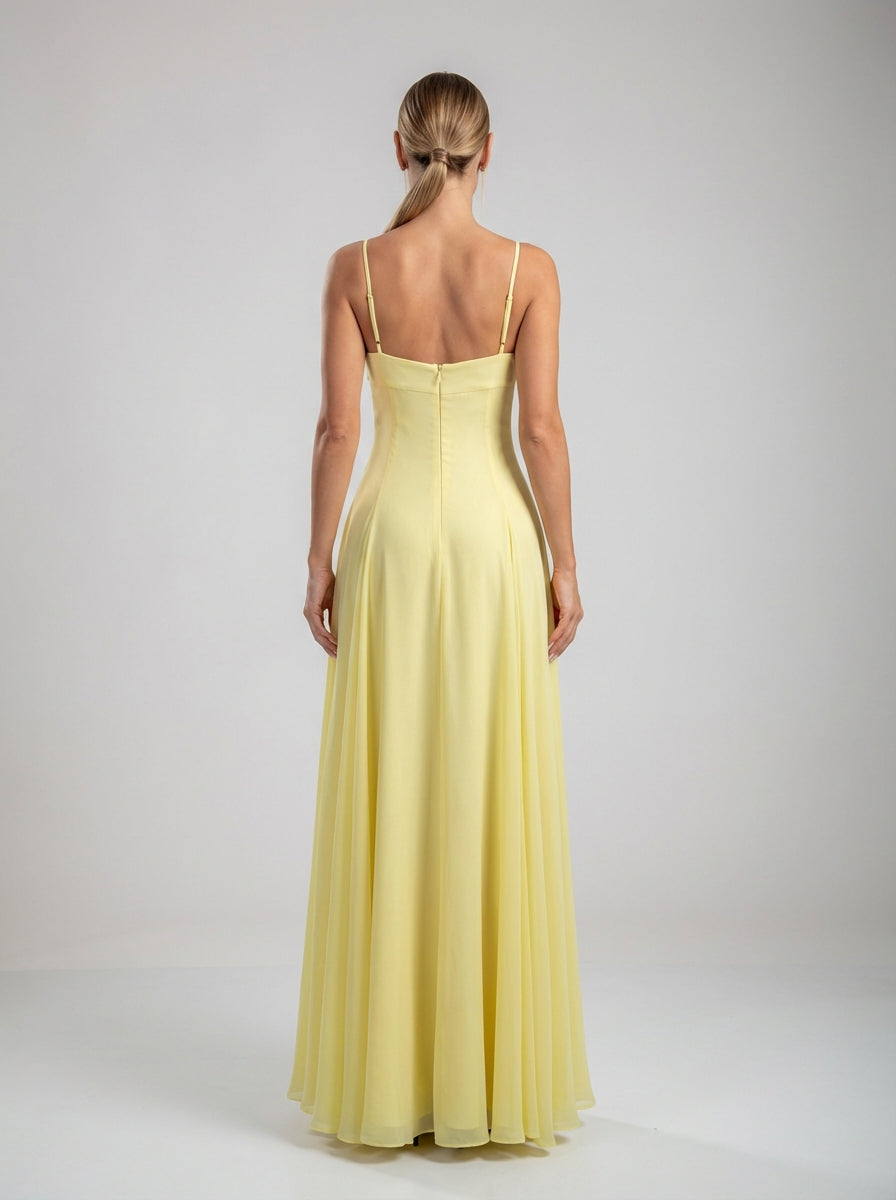 Perfect for weddings, formal events, summer galas, and elevated evening occasions, the Soleil Flow Gown is ideal for women seeking a yellow evening gown, soft chiffon formal dress, or a refined silhouette that feels luminous without excess.