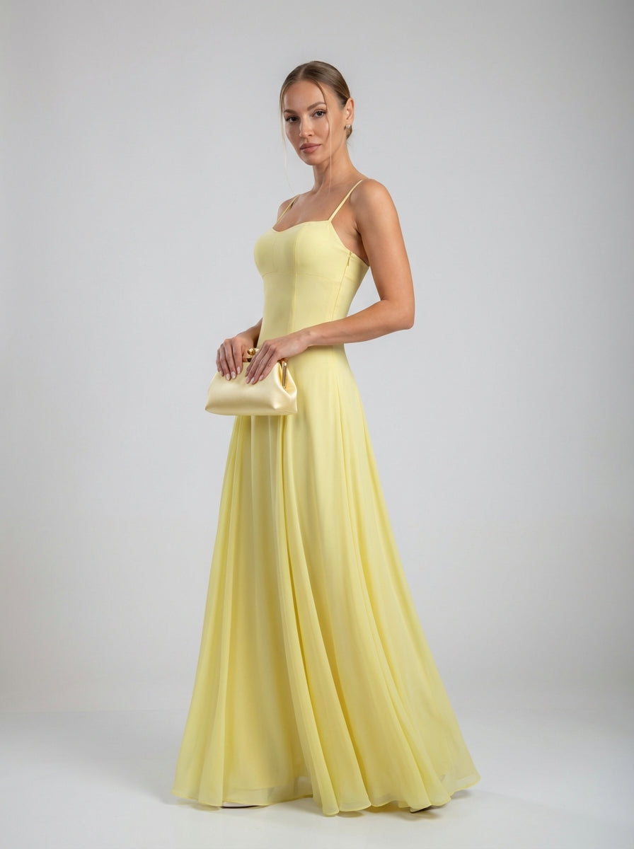 Soleil Flow Gown is a pastel yellow floor-length chiffon dress with a fitted bodice and flowing skirt for elegant occasions.