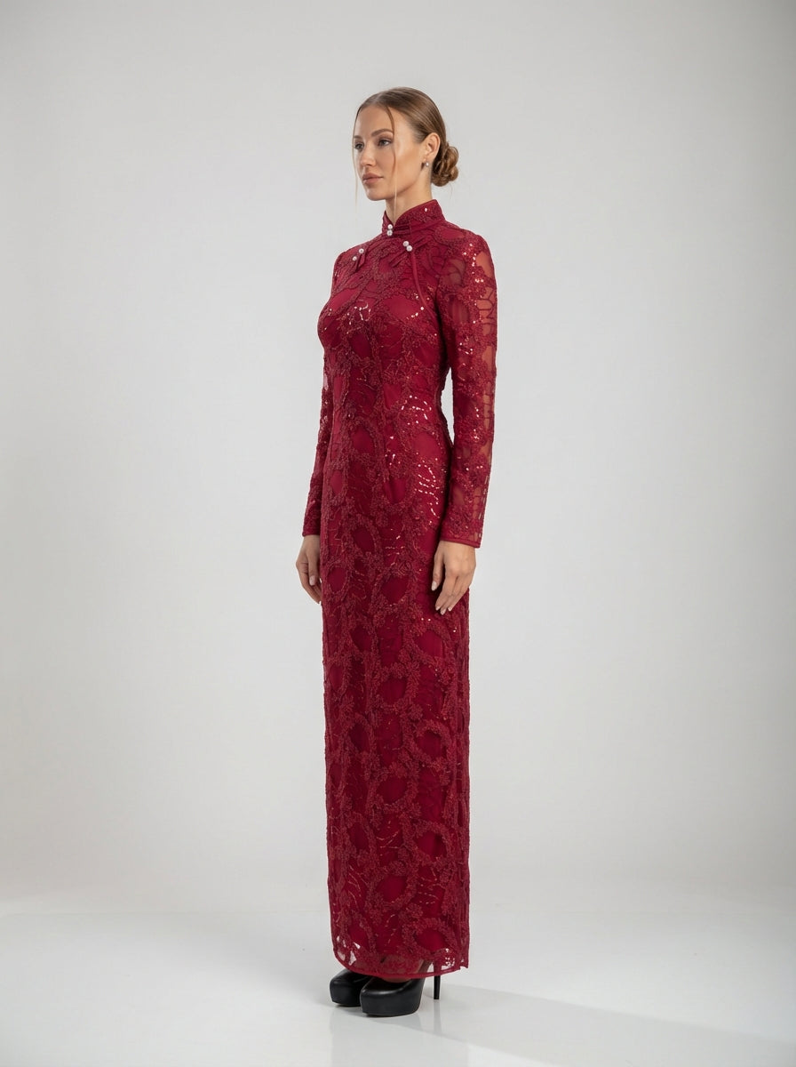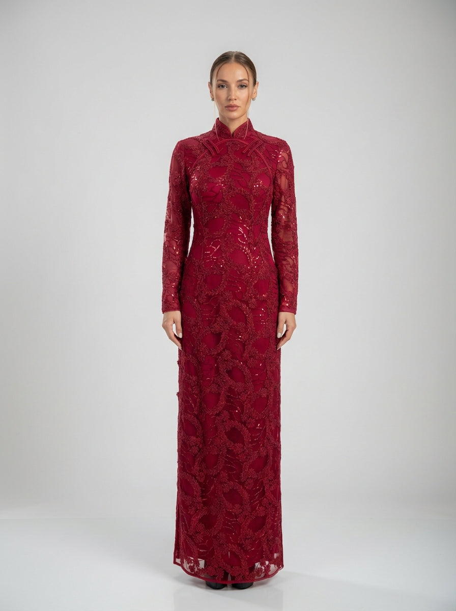 השמלה מעוצבת עם צווארון גבוה מובנה ושרוולים ארוכים וצמודים, ומציעה קו חינני ומוארך המחמיא לגזרה ללא הגזמה. כיסוי התחרה כולל מוטיב בוטני מעוטר, שקוף בעדינות בשרוולים ובמחוך לעומק, בעוד בטנה חלקה מבטיחה נוחות וכיסוי לכל אורכו. חצאית עמודים חלקה נופלת ללא מאמץ עד הרצפה, ויוצרת צללית מאוזנת ופסלנית.