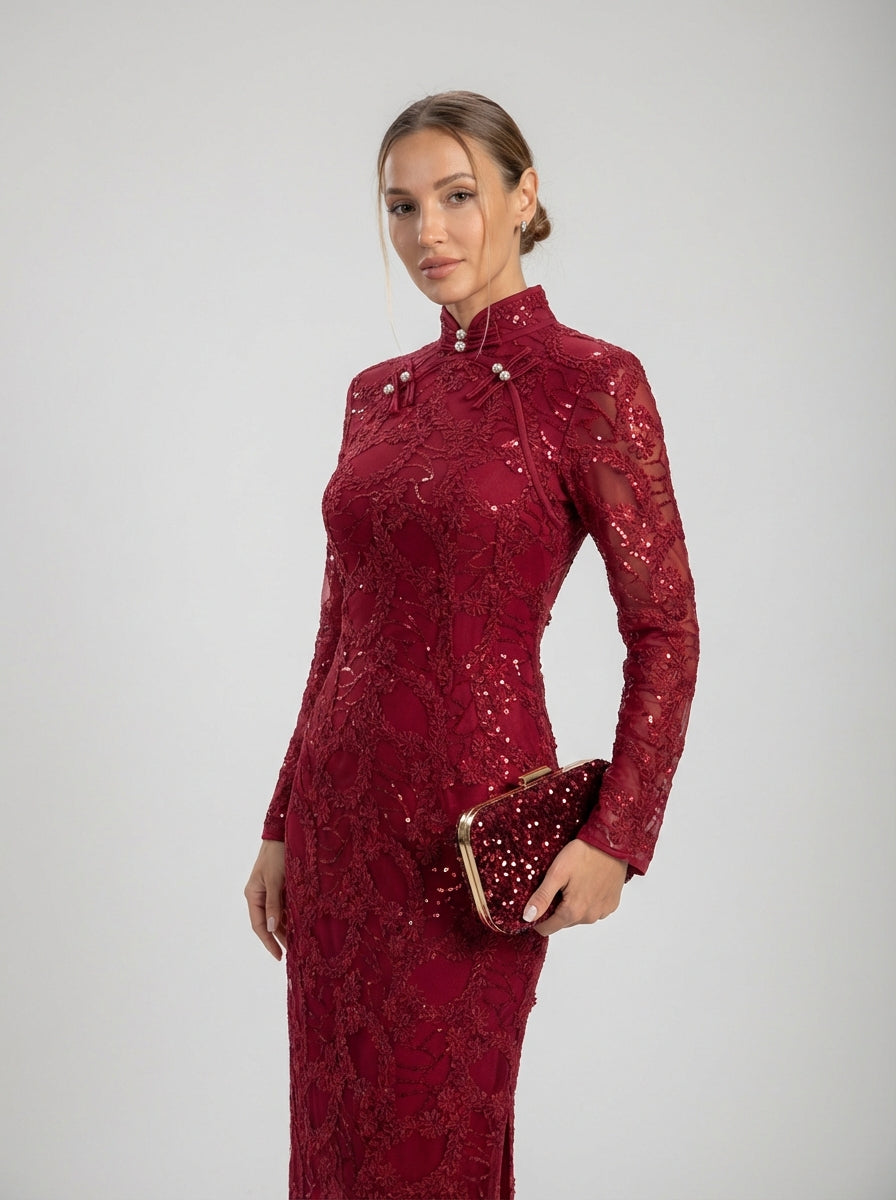 אידיאלית לאירועי ערב, קבלות פנים רשמיות ואירועים מיוחדים, שמלת העמודה של סלסט מבד תחרה מושלמת עבור אלו המחפשות שמלת תחרה עם שרוולים ארוכים, שמלת ערב עם צווארון גבוה או מראה רשמי בצבע בורדו מעודן.