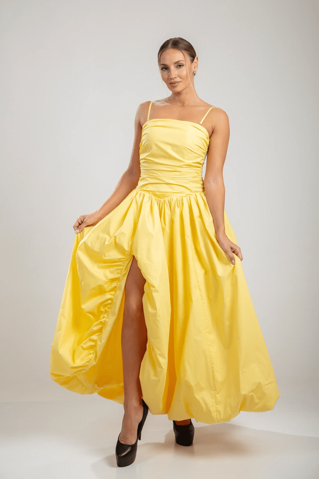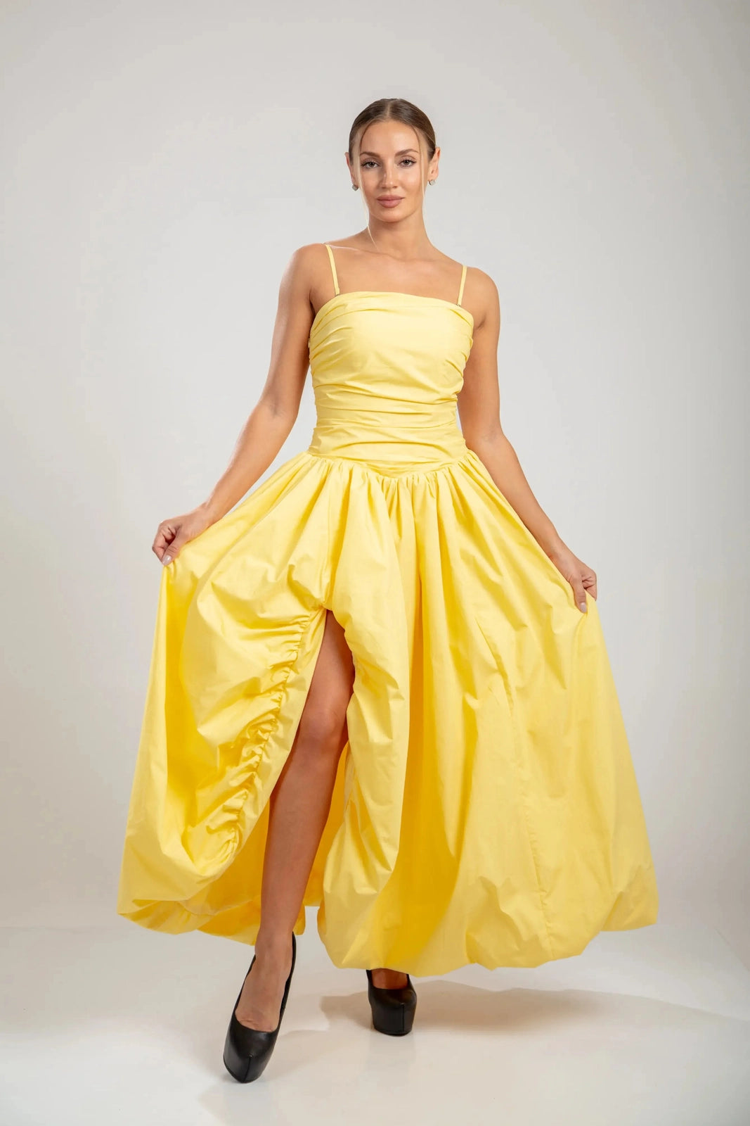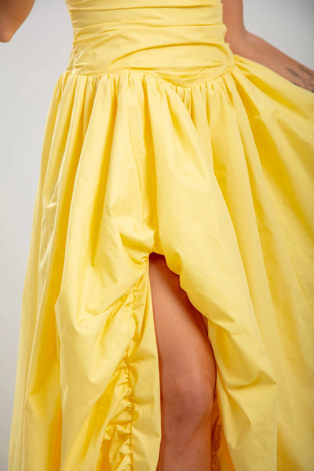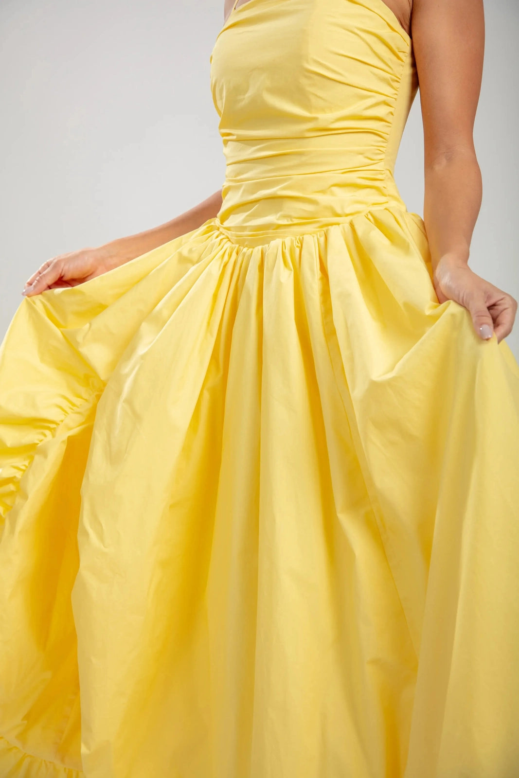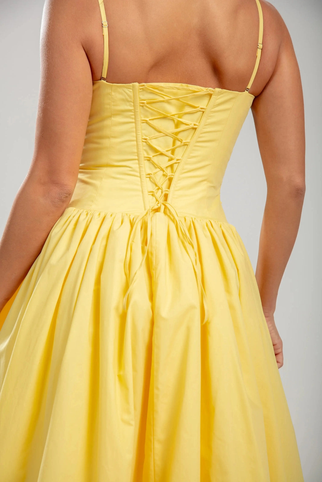 שמלת מרסלין היא חלום בצבע צהוב חמאה מכותנה. החלק העליון המוקפץ מעצב את הדמות עם אלגנטיות נוסטלגית, בעוד שהגב הקשתי מאפשר התאמה אישית ומחמיאה. השמלה זורמת אל חצאית רחבה ומקופלת, והיא נעה עם קלילות אוורירית אך שומרת על נוכחות מסודרת בזכות הבד הכותנה הטבעי.