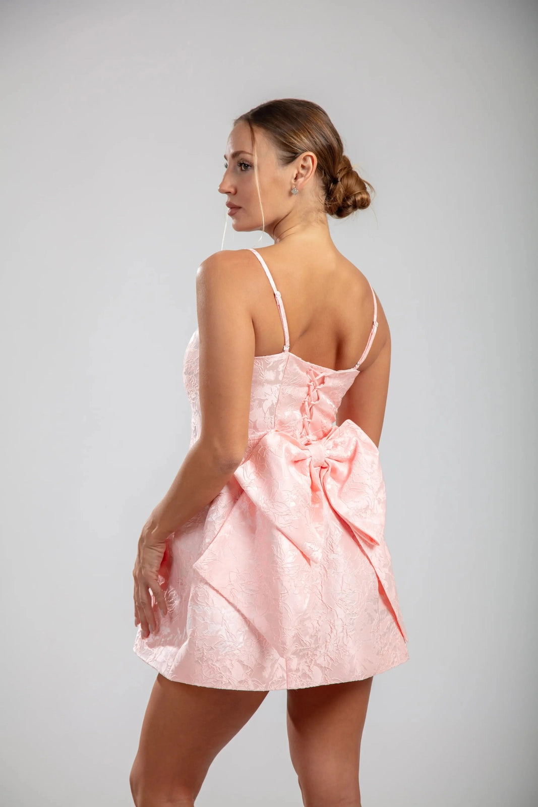 השמלונת רוזבל היא הצהרה של רומנטיקה עם נגיעה מודרנית. עשויה מבד ג'קרד פרחוני תלת-ממדי, החלק העליון הצמוד שלה מאוזן על ידי קשת גדולה ומרשימה מאחור, מה שיוצר סילואט פסלי. הגב עם השרוכים המתכווננים משפר את ההתאמה, בעוד שהרצועות הדקות וקו הצוואר המרובע הנקי מעצבים את הכתפיים בצורה אלגנטית.