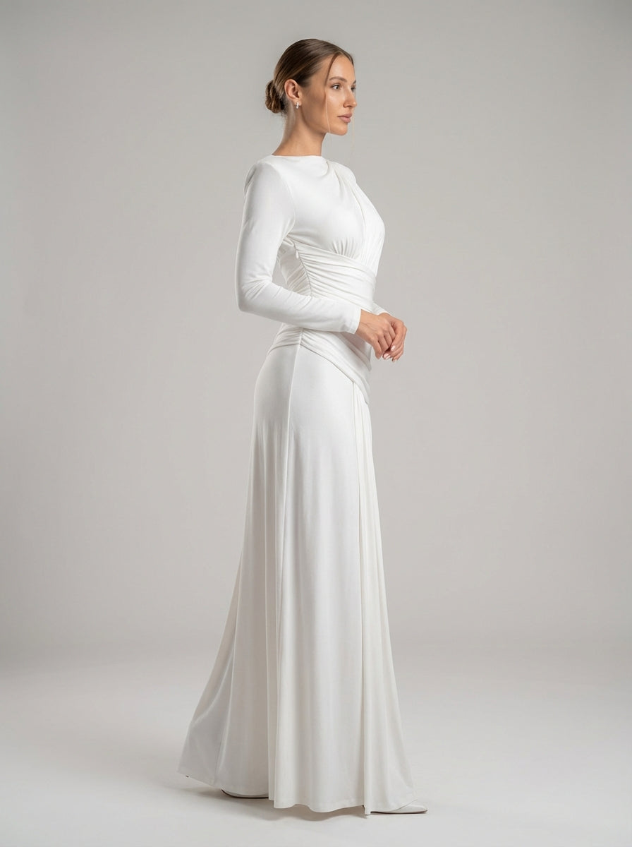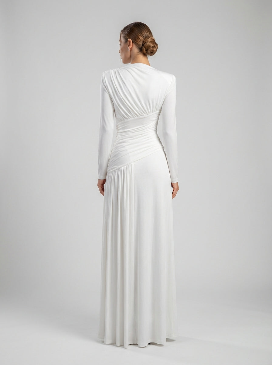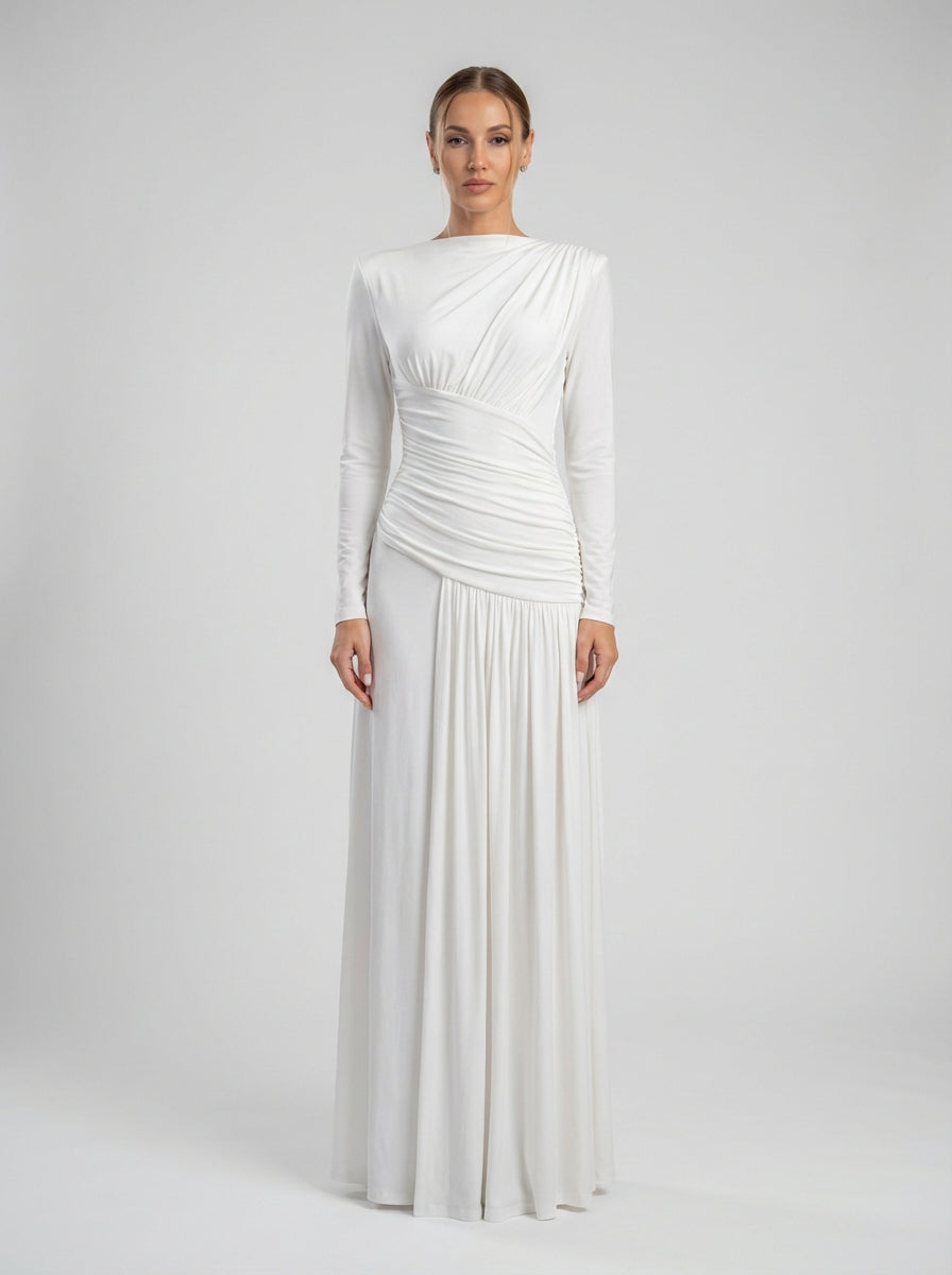 שמלה בצבע שנהב ארוך שרוולים זו כוללת צווארון גבוה מוגבה הממסגר את עצם הבריח בעוצמה שקטה, בעוד שקיפול אלכסוני מהונדס בדיוק רב מהדק את המותניים ומפסל את פלג הגוף העליון. קו המותניים האסימטרי המקומט זורם לחצאית רכה באורך הרצפה, הנעה בחן נוזלי, ויוצרת התארכות ואלגנטיות פסלנית מכל זווית.
