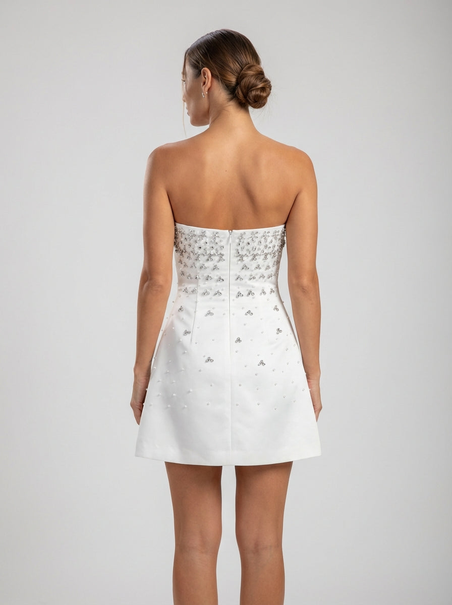 קישוטי קריסטל מפוזרים בעדינות על פני המחוך והחצאית, מרוכזים ליד קו הצוואר ומתפזרים כלפי מטה כמו אבק כוכבים נופל. המיקום יוצר אפקט נצנוץ הדרגתי - מעודן, מבוקר, בלתי נשכח.
