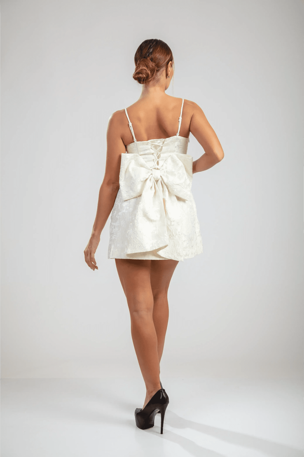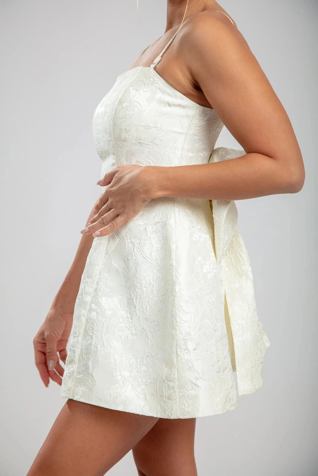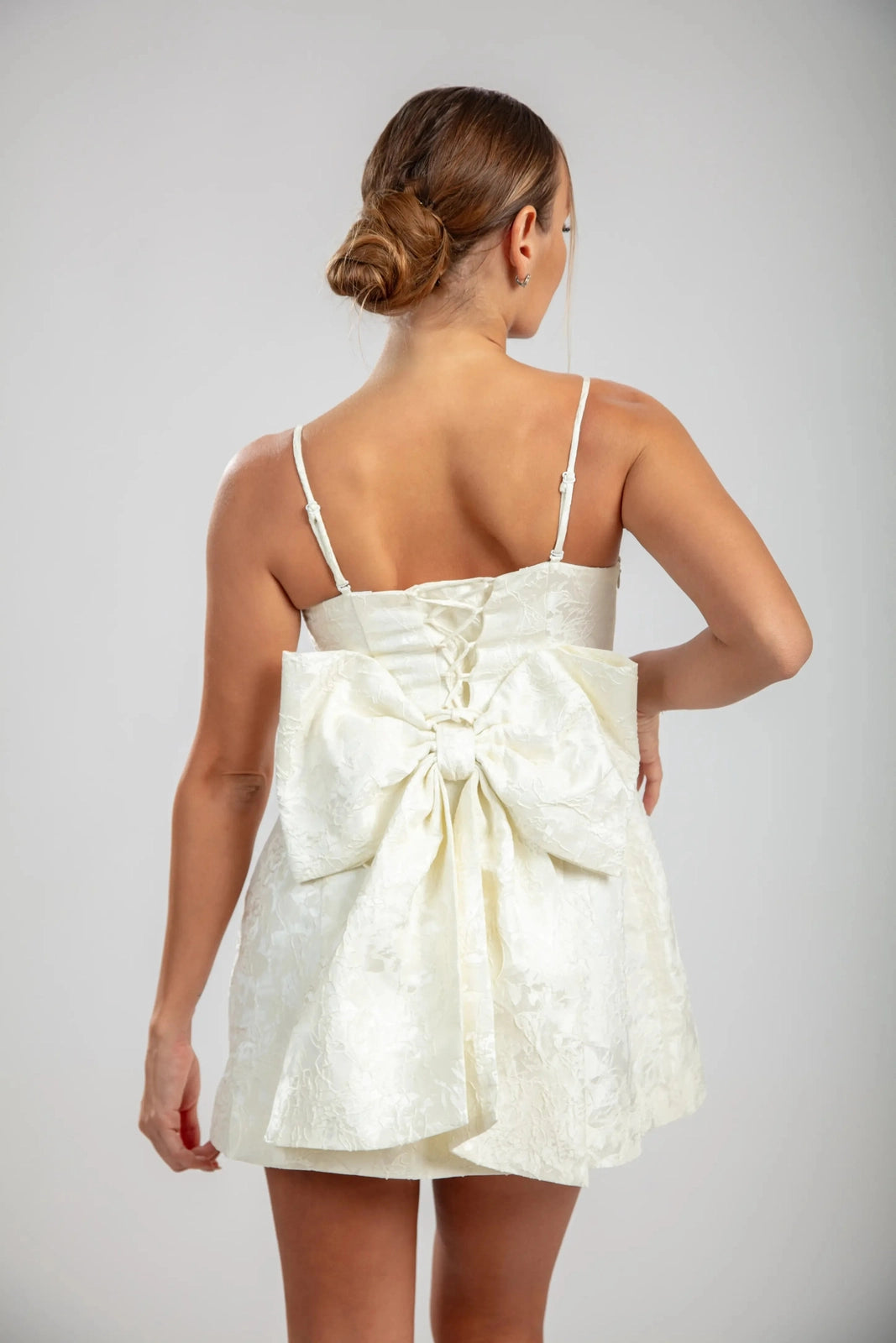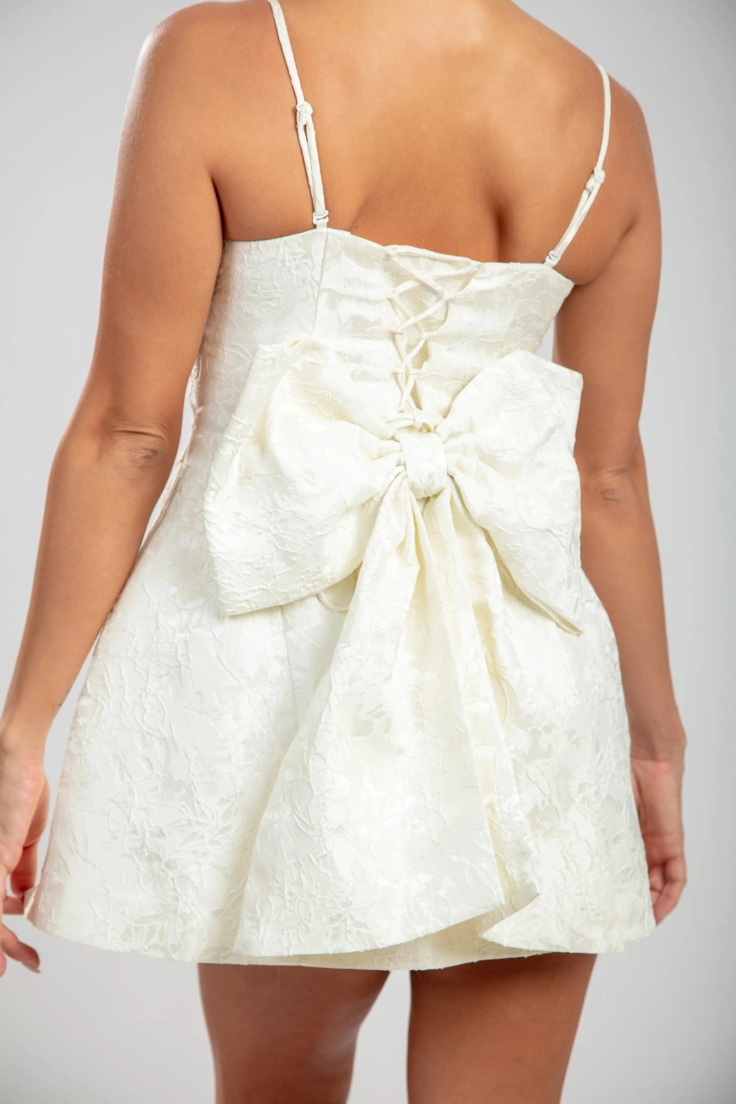 השמלות מיני רוזבל בלבן מגדירה מחדש את הקסם הנשי עם אלגנטיות מובנית. עשויה מבד ג'קרד פרחוני בתלת מימד, העיצוב באורך מיני כולל גוף צמוד, רצועות עדינות, וגב עם שרוכים להתאמה. הקשת המפוסלת הגדולה שלה הופכת את השמלה לבלתי נשכחת, מושלמת לחגיגת הרגעים הבלתי נשכחים של החיים.