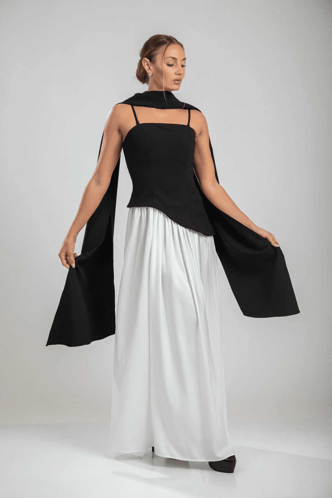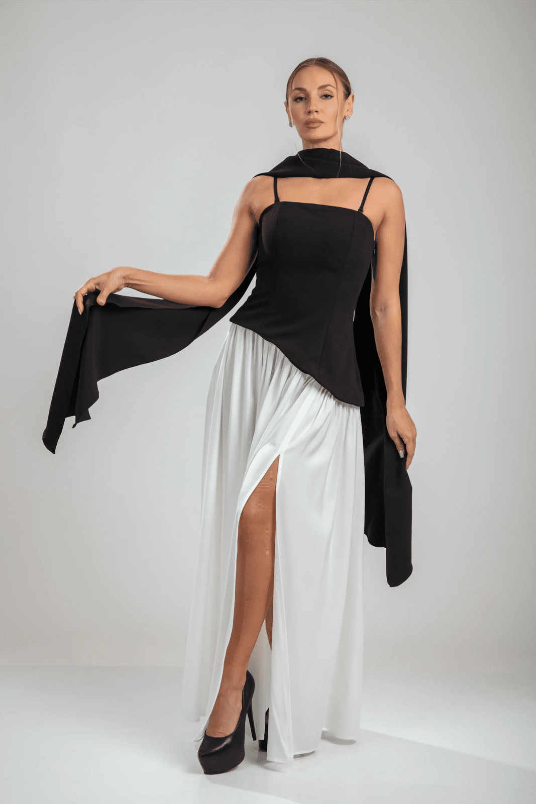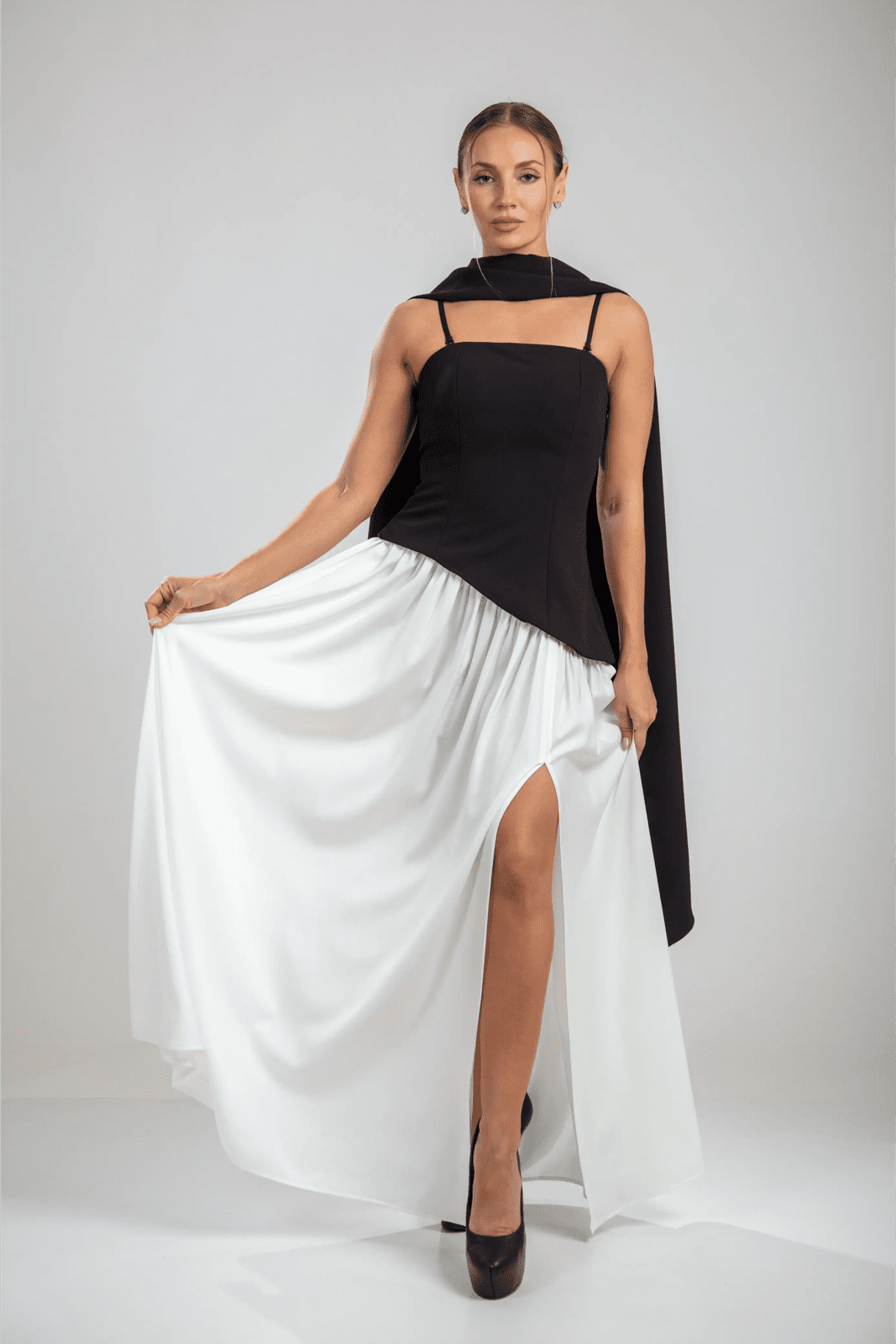 שמלת הסרפין בצבעים שחור/לבן מגלמת דו-ערכיות קולנועית. החלק העליון ללא רצועות בצבע שחור כהה מעצב את הדמות עם קו מותן אסימטרי, מאוזן על ידי חצאית לבנה מתנפנפת שזורמת עם אלגנטיות מעודנת. צווארון עם צעיף דרמטי מסגרת את הכתפיים, בעוד שהגב עם השרוכים מאפשר התאמה אישית.