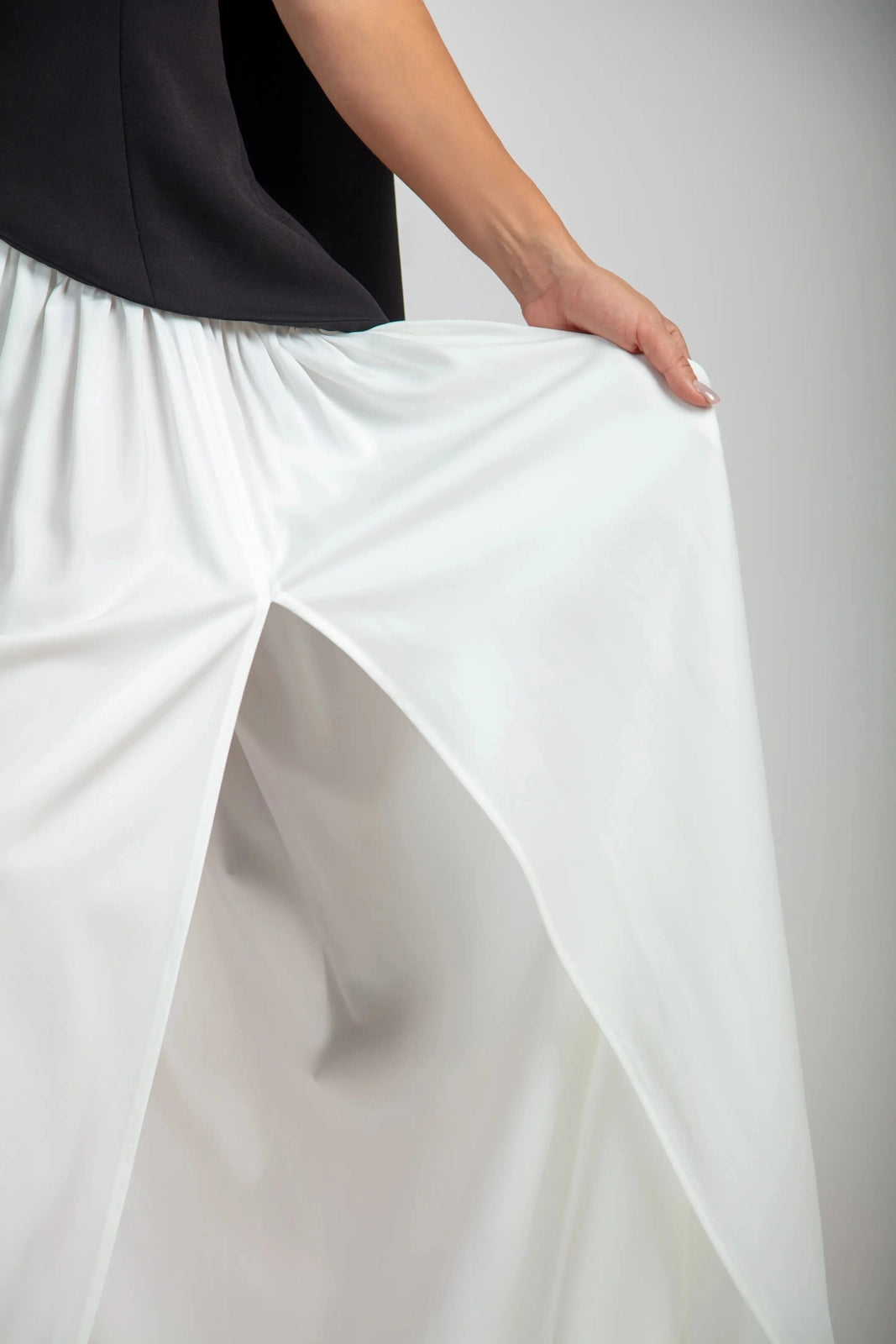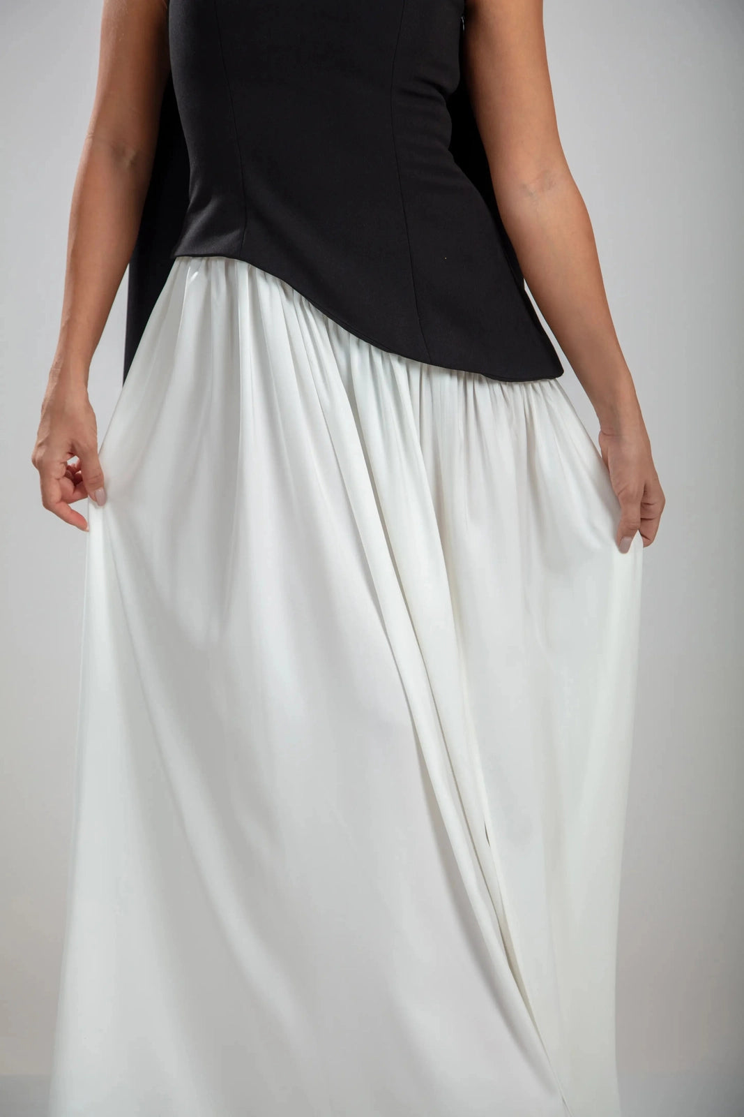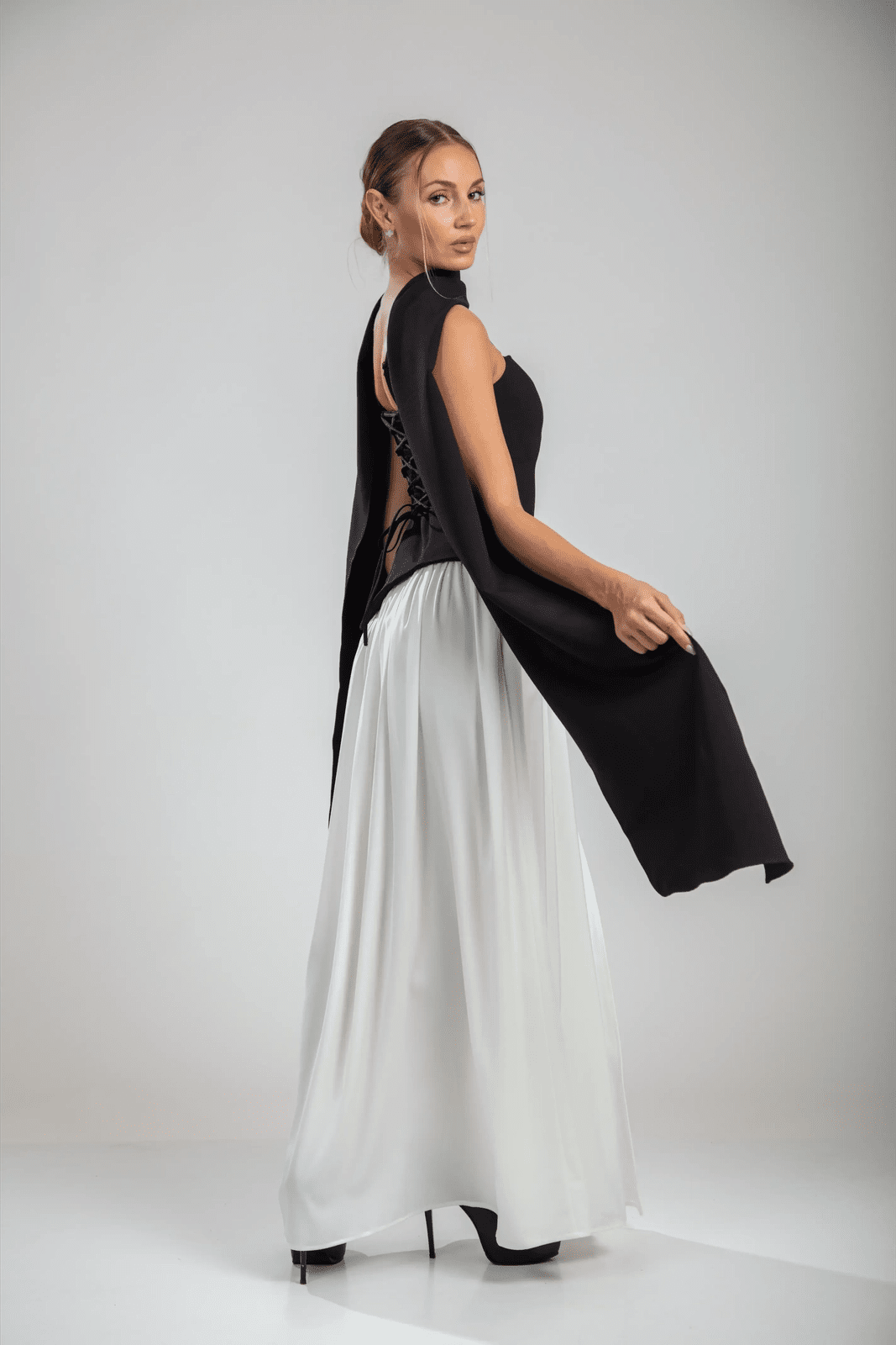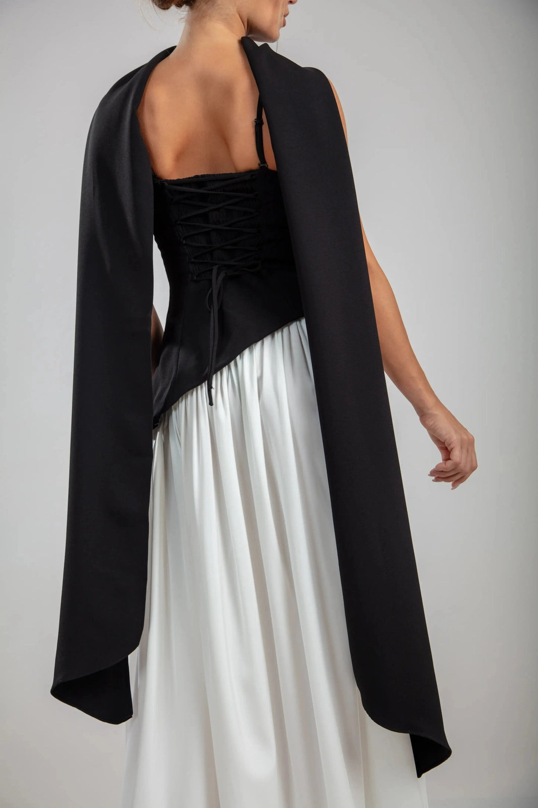 שמלת הסרפין בצבעים שחור/לבן מגלמת דו-ערכיות קולנועית. החלק העליון ללא רצועות בצבע שחור כהה מעצב את הדמות עם קו מותן אסימטרי, מאוזן על ידי חצאית לבנה מתנפנפת שזורמת עם אלגנטיות מעודנת. צווארון עם צעיף דרמטי מסגרת את הכתפיים, בעוד שהגב עם השרוכים מאפשר התאמה אישית.