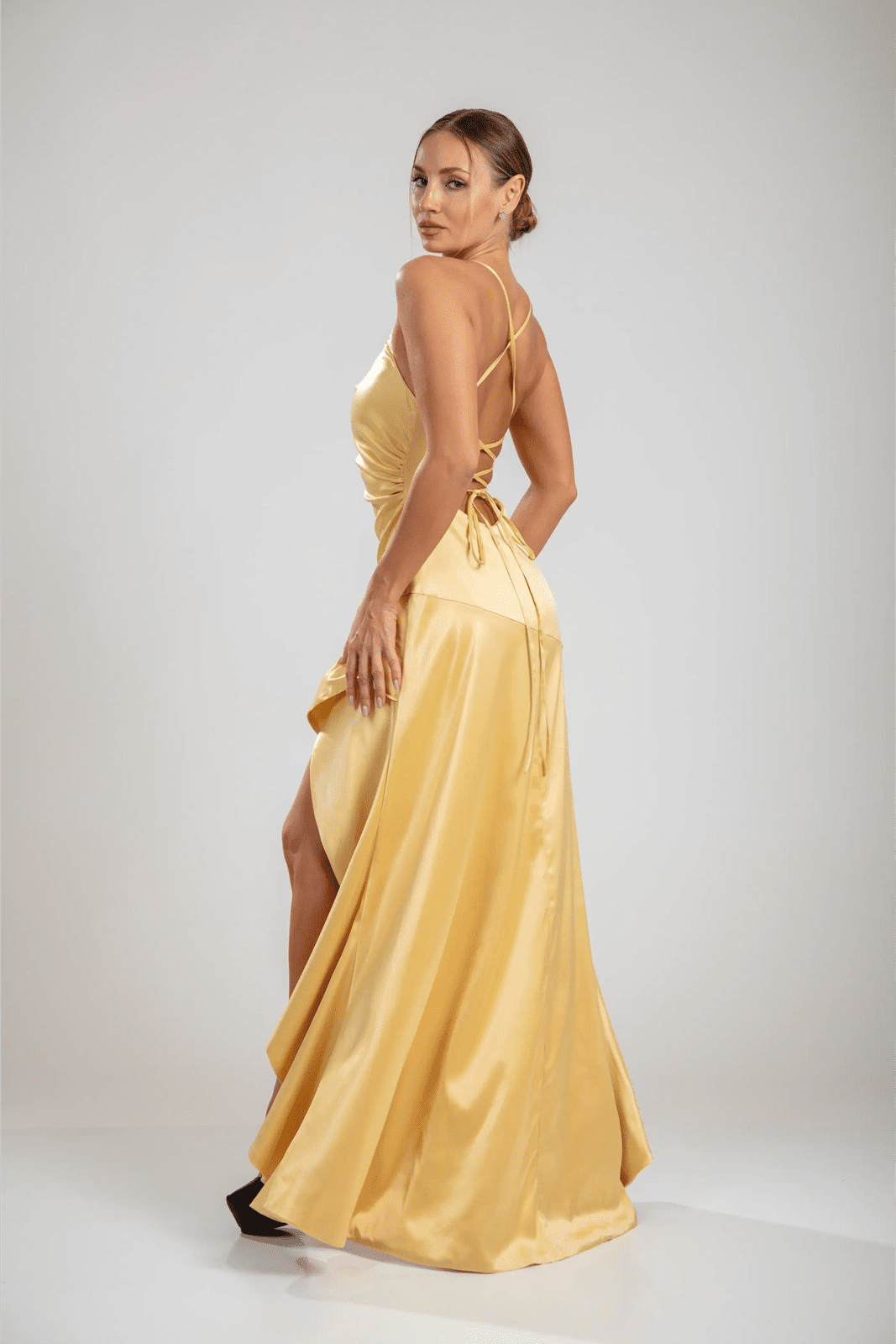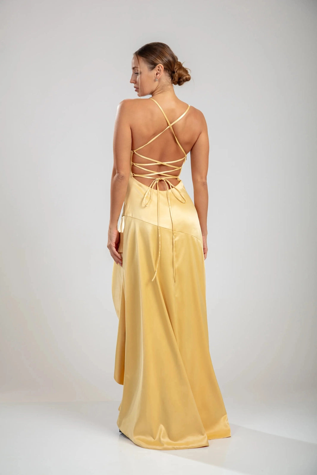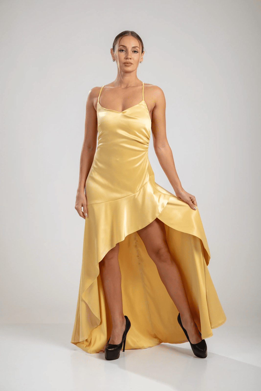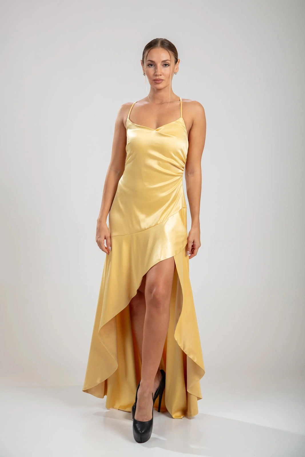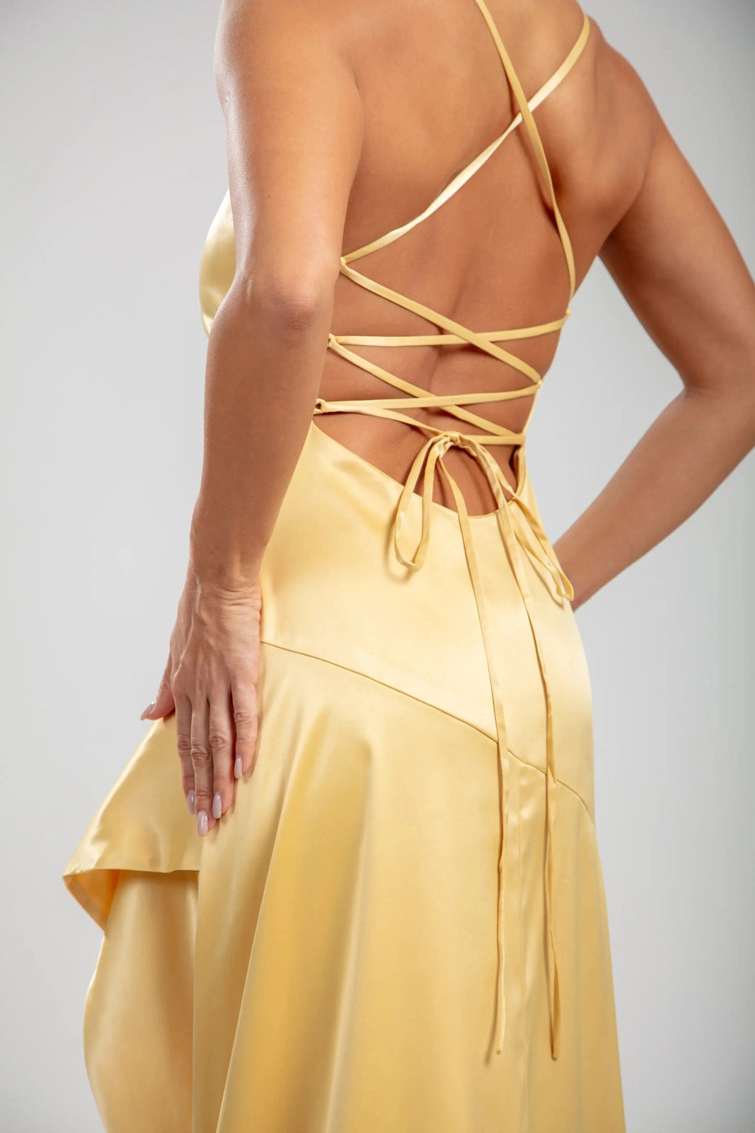 שמלות סולן קסקדה משקפות אלגנטיות זהובה וחן זורם. בעיצוב של סטן צהוב-לימון, הצווארון המושך והמותן המוקפצת מעצבים את הדמות בעוד שהחצאית האסימטרית גבוהה-נמוכה זורמת עם דרמה מתגלגלת. גב עדין עם שרוכים מבטיח יכולת התאמה ומשיכה מכל זווית, מאזן בין sophistication לבין תנועה משחקית.