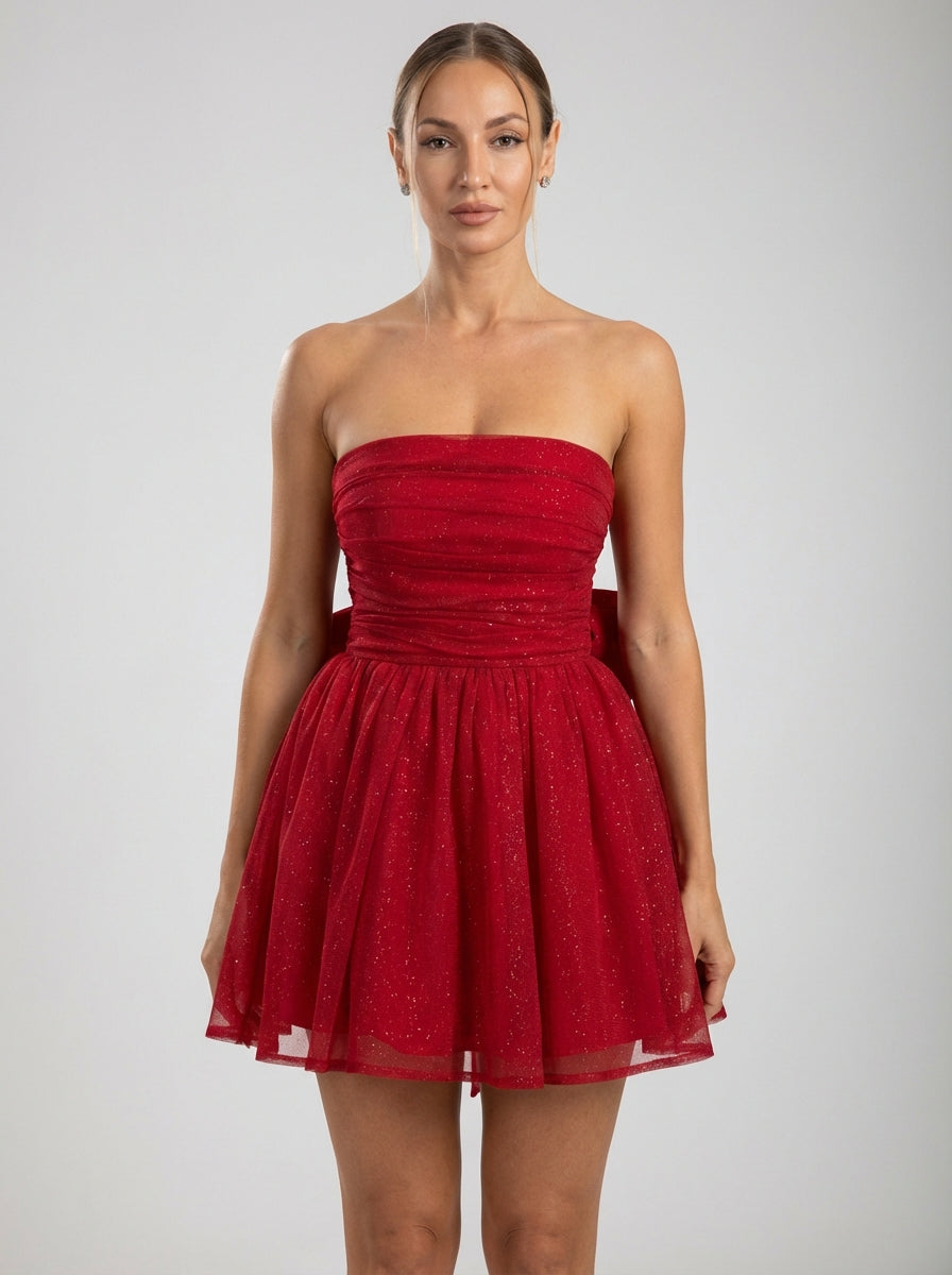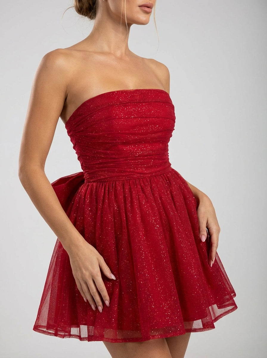 שמלת מיני אדומה נוצצת ללא כתפיות עם חצאית מתרחבת וגב עם קשת גדולה במיוחד.