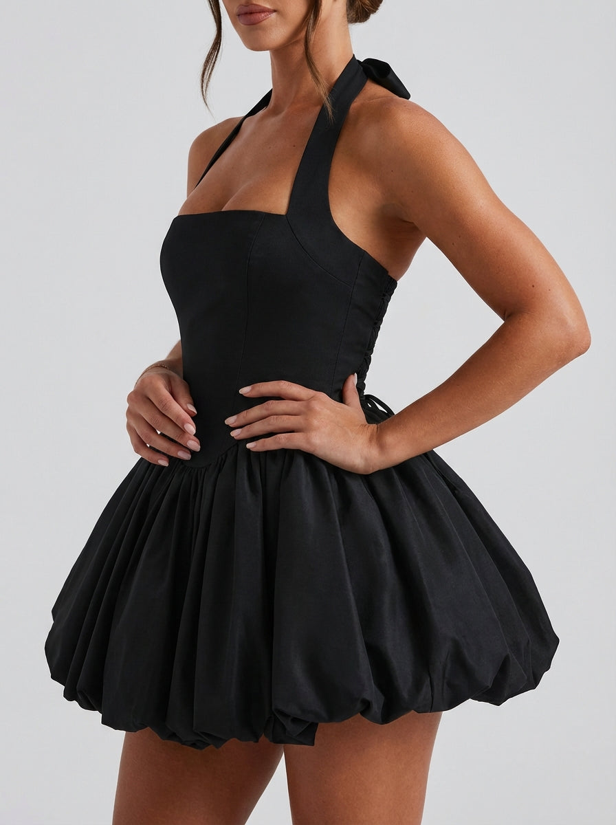 שמלת מיני בגזרה חלקה עם מחוך מחוך וחצאית בועות בגזרה רחבה. צללית מעוצבת ומודגשת לערב ולאירועים מיוחדים.