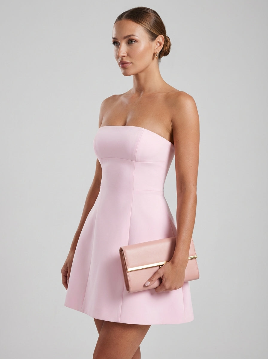 שמלת מיני ורודה ללא כתפיות עם מחוך מעוצב וחצאית מובנית. נשית וצמודה.