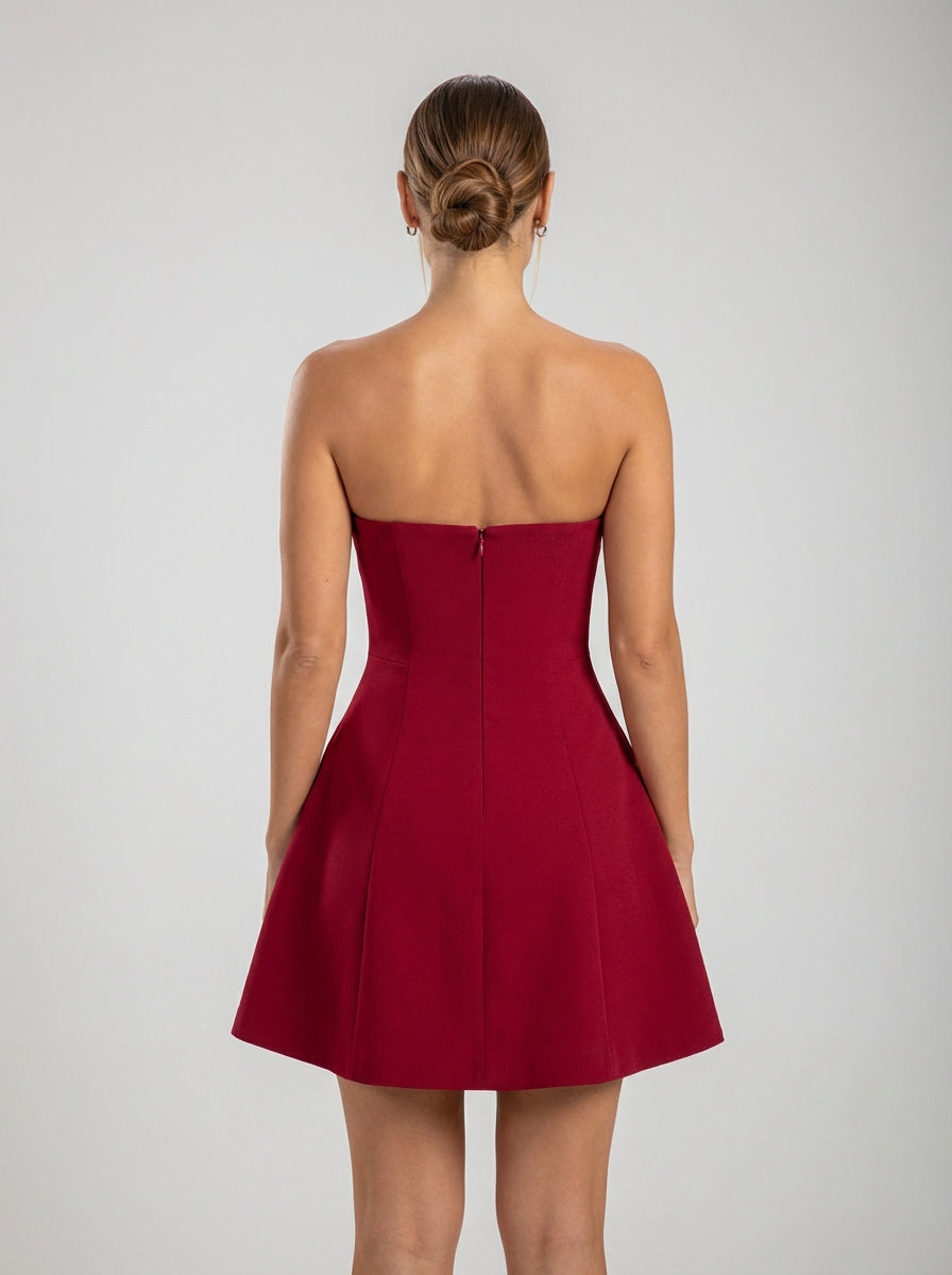 שמלת מיני אדומה ללא כתפיות עם מחוך מעוצב וחצאית מתרחבת. נועזת ובטוחה בעצמה.