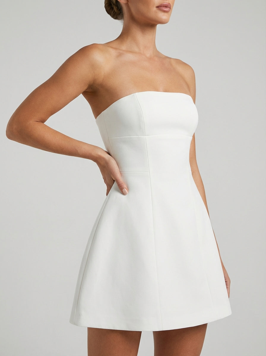 שמלת מיני לבנה ללא כתפיות עם מחוך מעוצב וצללית נקייה. אלגנטית ומודרנית.