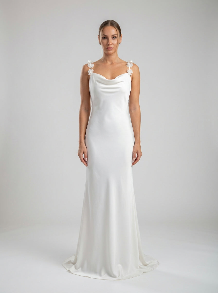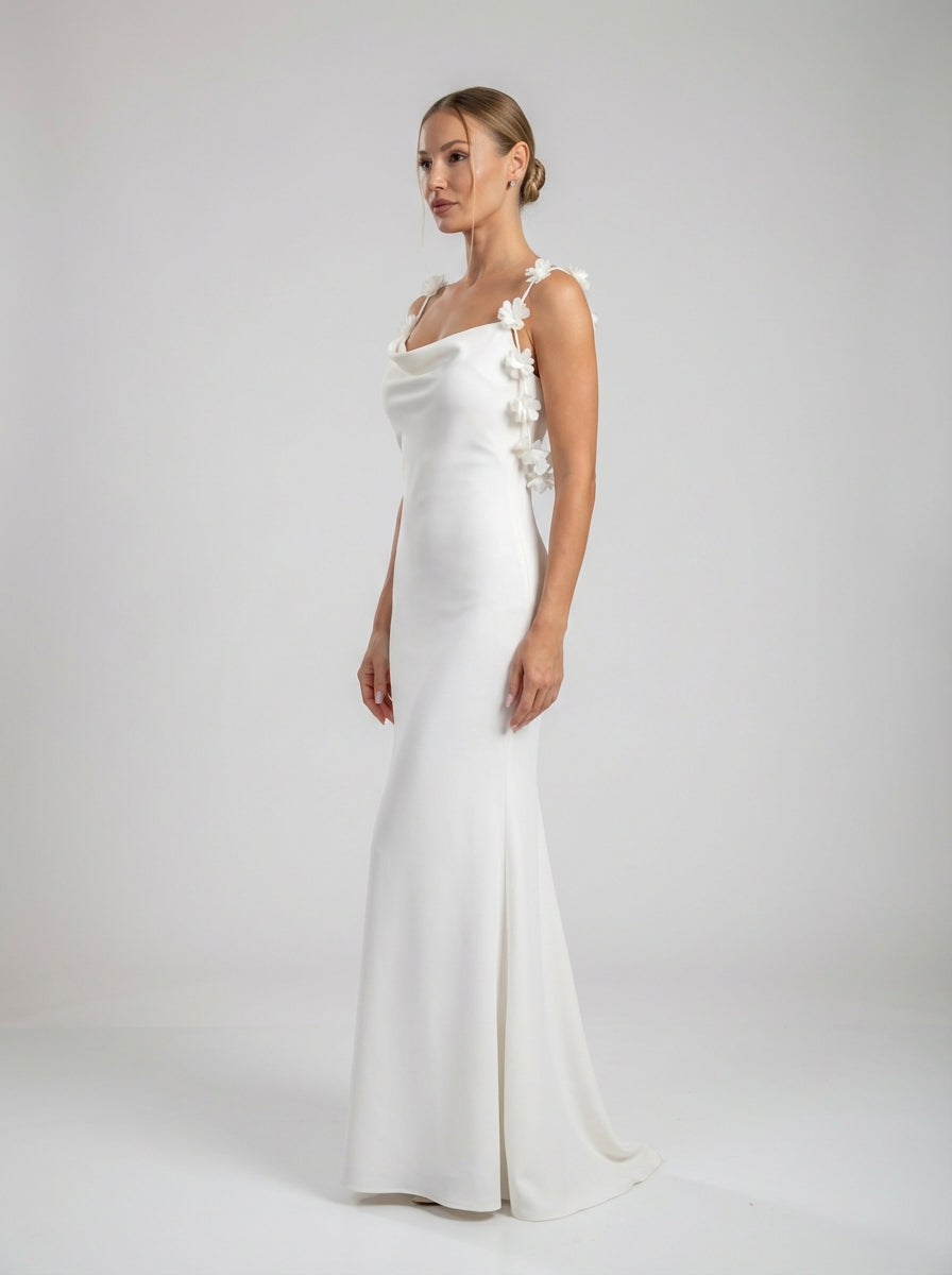 החלק העליון מציג צווארון רך ומקושט שמסגרת את הדקולטה עם אלגנטיות מעודנת, בעוד רצועות הכתף העדינות מעוטרות באפליקציות פרחוניות תלת-ממדיות, מוסיפות מרקם ופרטים אומנותיים מבלי להעמיס על הקווים הנקיים. החיתוך צמוד במותן ובירך, והשמלה מתרחבת בעדינות בקצה, מאריכה את הדמות ומחזקת את התנועה בחן.