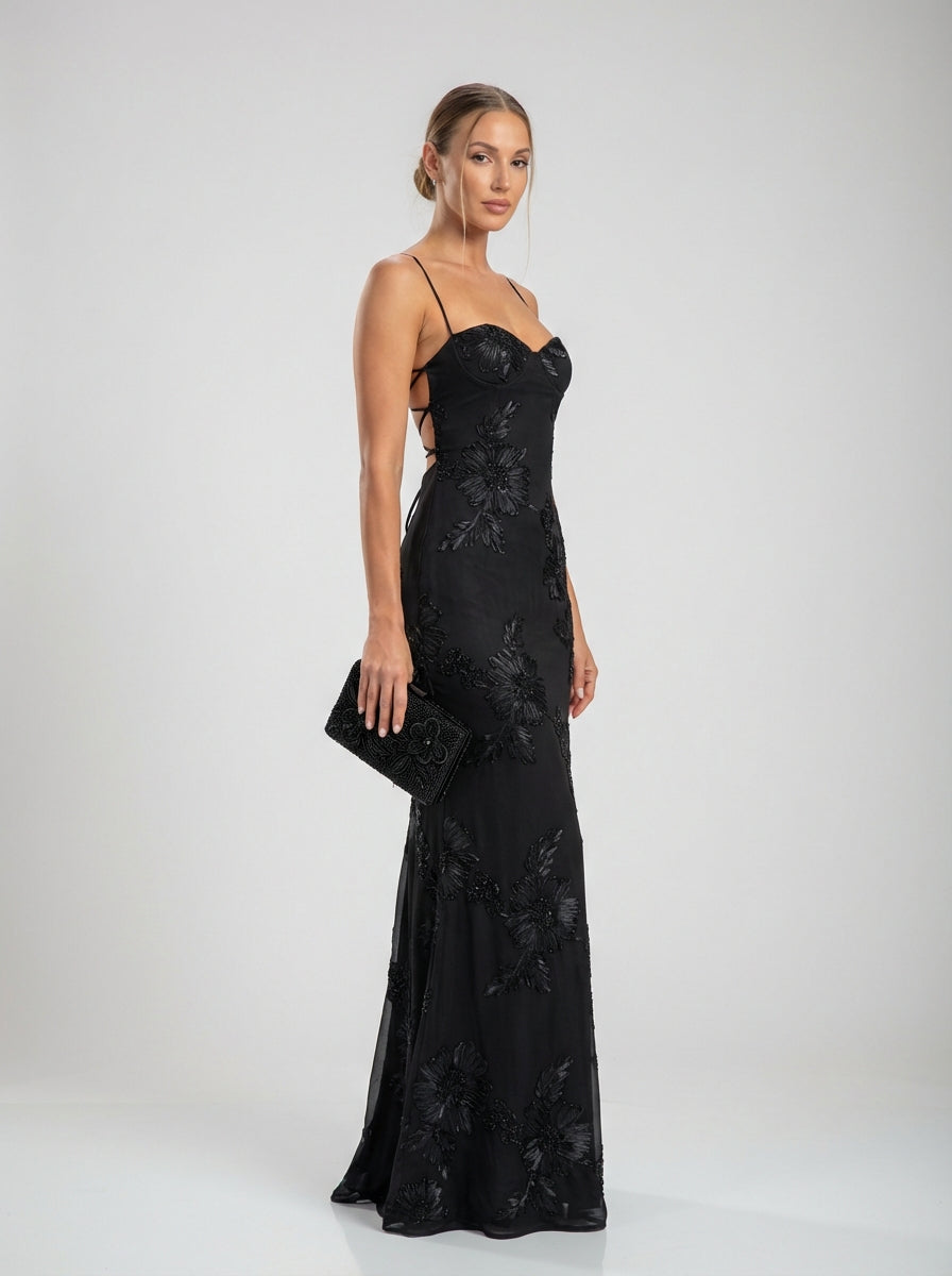 שמלת ערב שחורה רקומה עם מחוך מחוך, גב עם שרוכים ופריטי רשת פרחוניים.