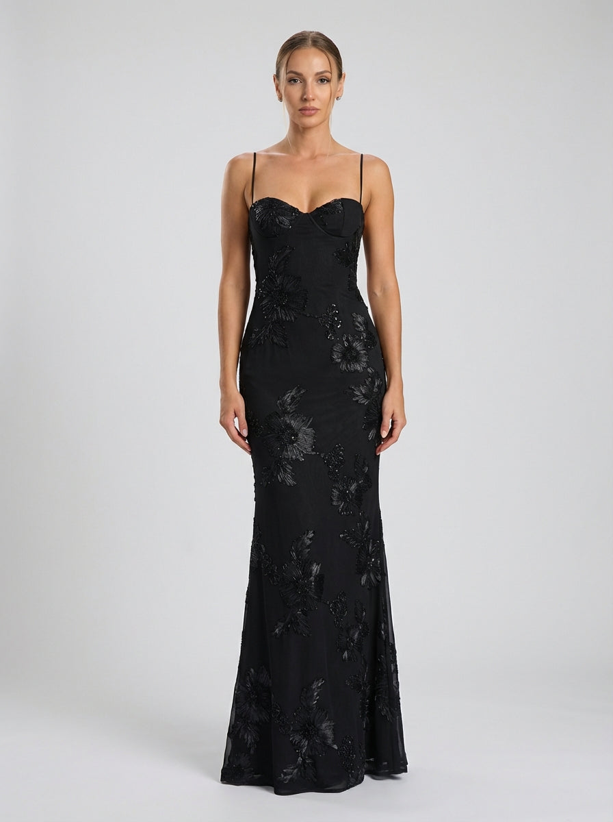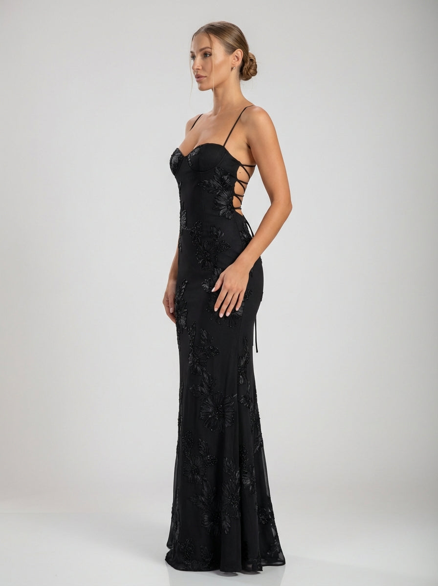 רצועות ספגטי עדינות מאזנות את המבנה הנועז של הגוף, בעוד שהגב המורכב עם השרוכים יוצר פרטים חושניים של גב פתוח עם תמיכה מתכווננת. רקמת פרחים שחורה מתפרסת על השמלה, מוסיפה עומק ומרקם על גבי הרשת השקופה. החצאית הצמודה מאריכה את הדמות לפני שהיא נופלת בקלות לרצפה, ומביאה sophistication קלאסית לאירועים רשמיים.
