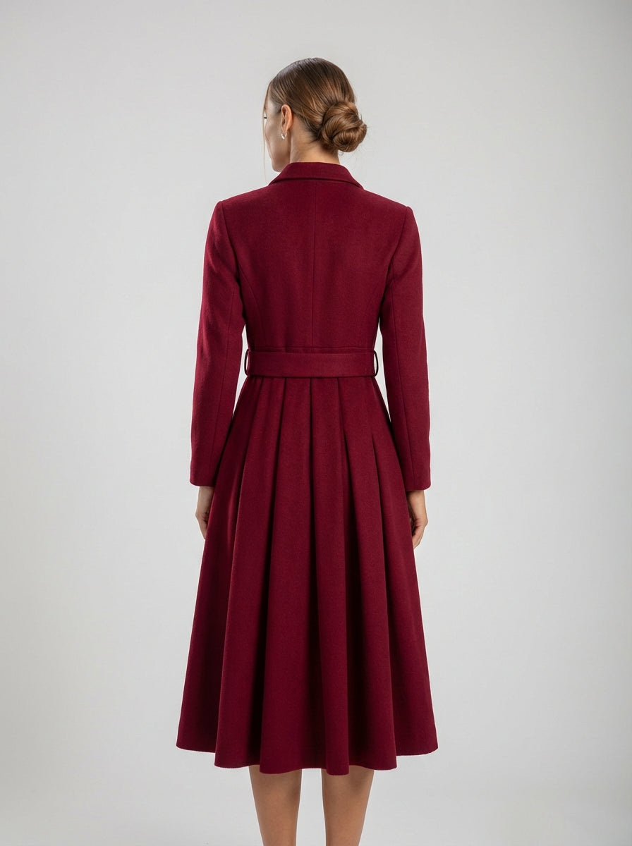 Featuring a sharp notched lapel and double-breasted front, the bodice is structured to sculpt the waist before flowing into a softly pleated A-line skirt. A matching belt with a fabric-covered buckle further defines the silhouette, while long sleeves and clean seamwork reinforce the dress’s architectural precision. The rich color adds depth and drama, elevating the design with quiet intensity.