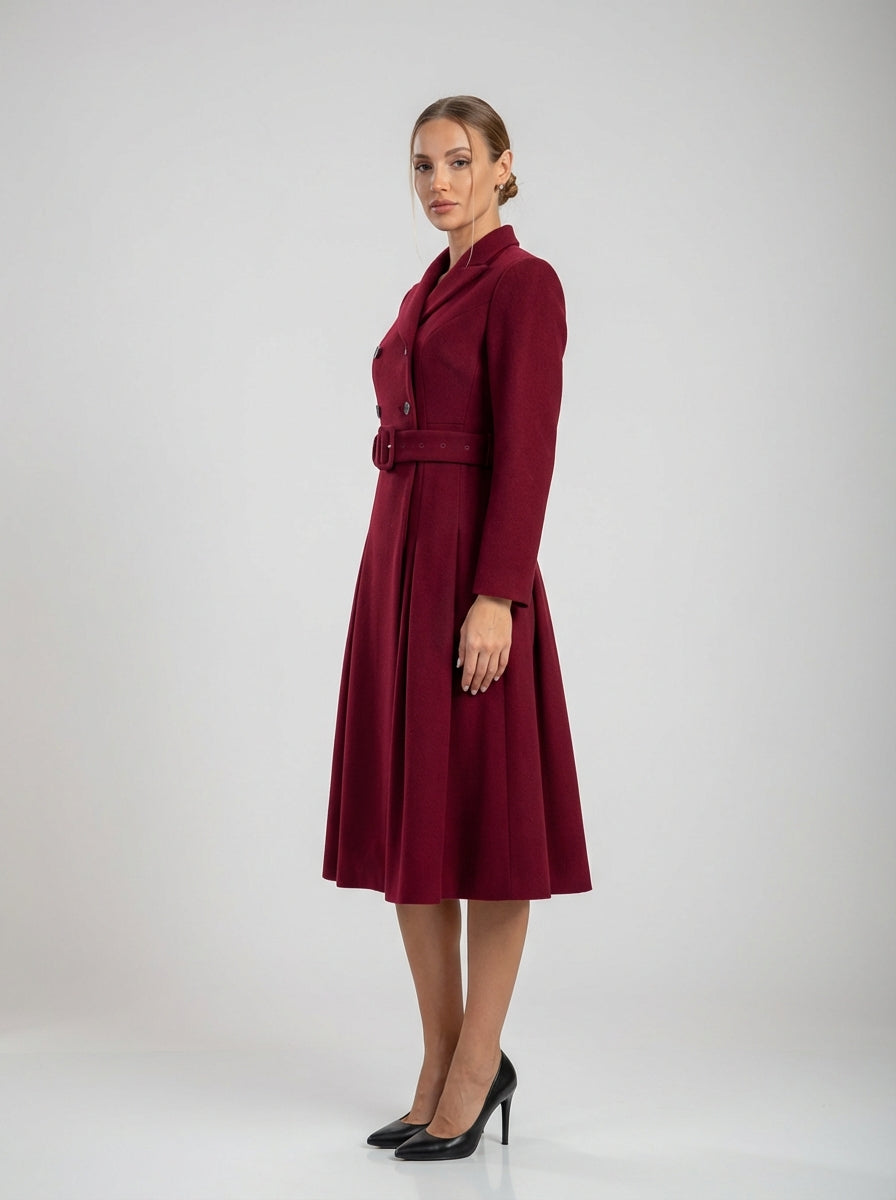 Isolde Double-Breasted Coat Dress is a tailored burgundy midi dress with a defined waist, belt detail, and structured elegance.