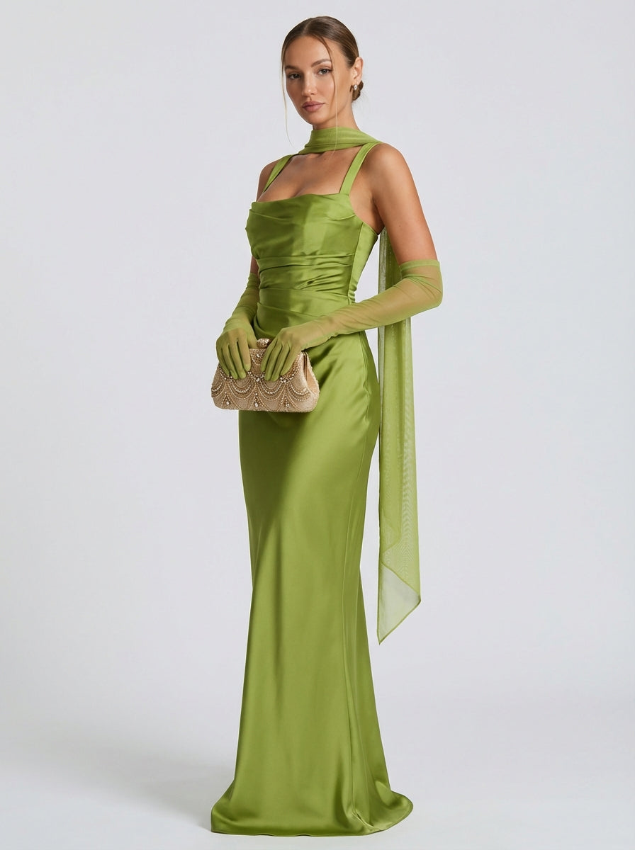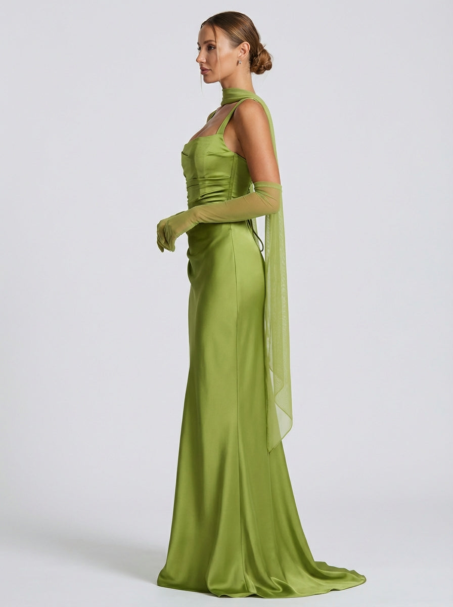 שמלת מחוך סאטן בצבע זית בהיר עם צווארון מרובע, גב עם שרוכים וצעיף קולר שקוף.