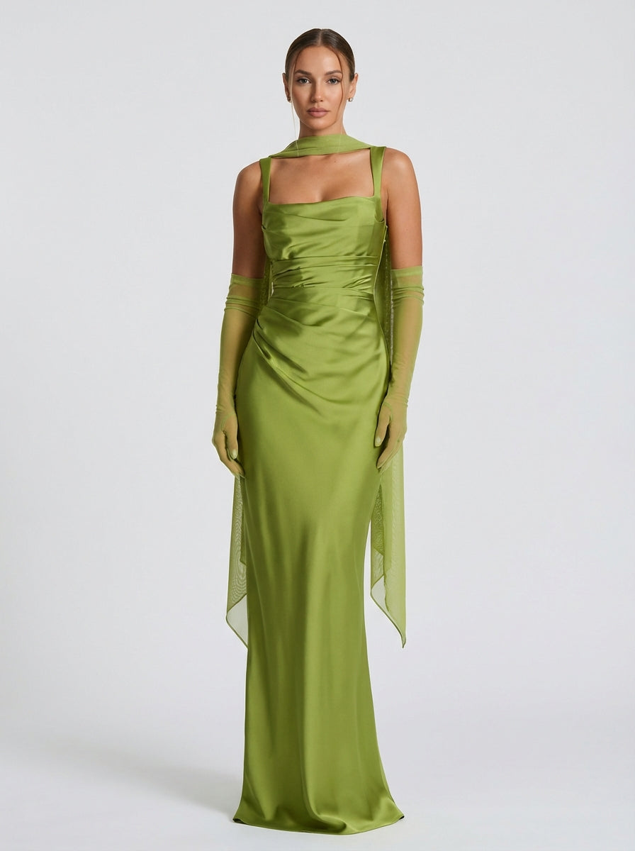 השמלות רגאליה היא כוח, צנוע. גזירת סאטן זית בהיר, הסילואט הזה באורך הרצפה משלב אלגנטיות בגווני אדמה עם מבנה ארכיטקטוני.