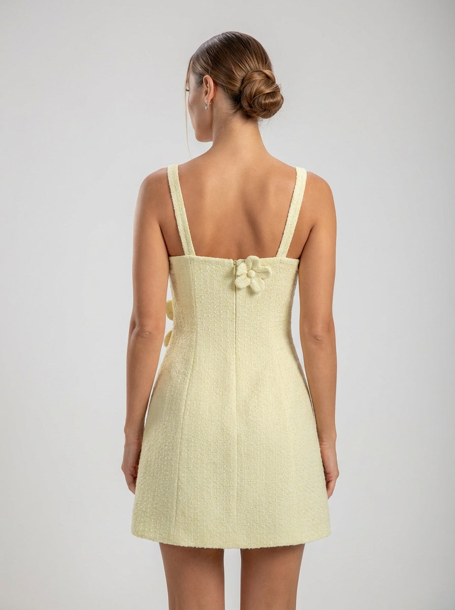 שמלת מיני עם טקסטורה, אפליקציות פרחוניות מפוסלות ורצועות מובנות.