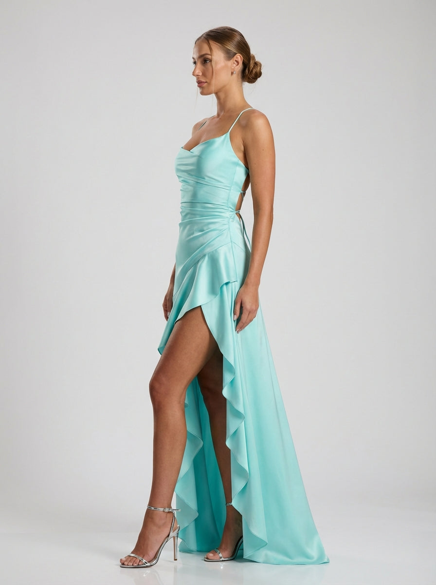 שמלת ערב סאטן טורקיז בהירה עם צווארון קפל, גב עם שרוכים, חצאית מדורגת ושס עד הירכיים.