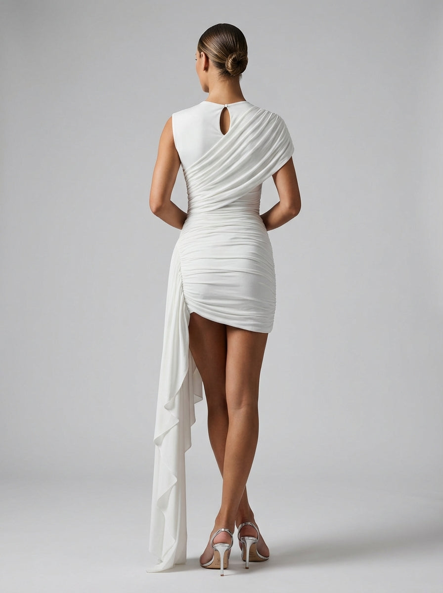 הוולורה דרייפ מיני – לבן הוא מיני מעוצב לערב שנועד לעצב את הגוף דרך נפילה זורמת ובנייה מדויקת. עשוי מג'רסי אלסטי עם גימור מט חלק, שמלה זו כוללת גוף אסימטרי עם כתף אחת שעוטף את הגוף, ויוצר סילואט חזק אך מעודן.