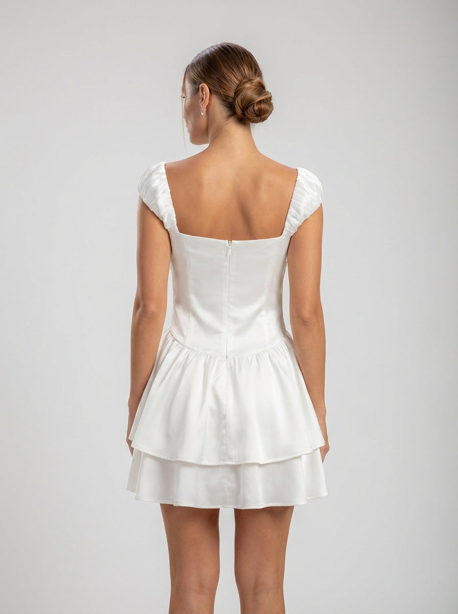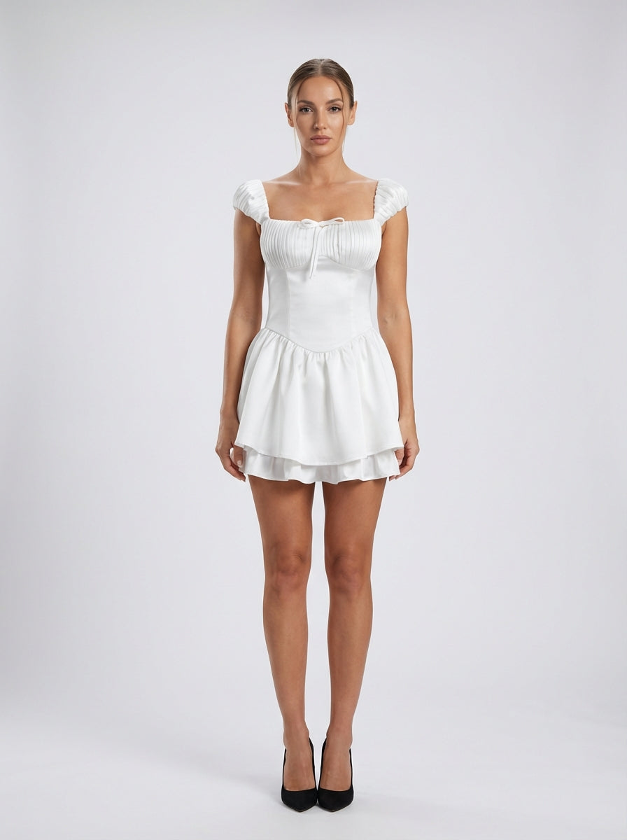 שמלת מיני לבנה עם שרוולים תפוחים, מחוך עם קפלים וקפלים וחצאית מדורגת למראה רכה אך מלוטשת.
