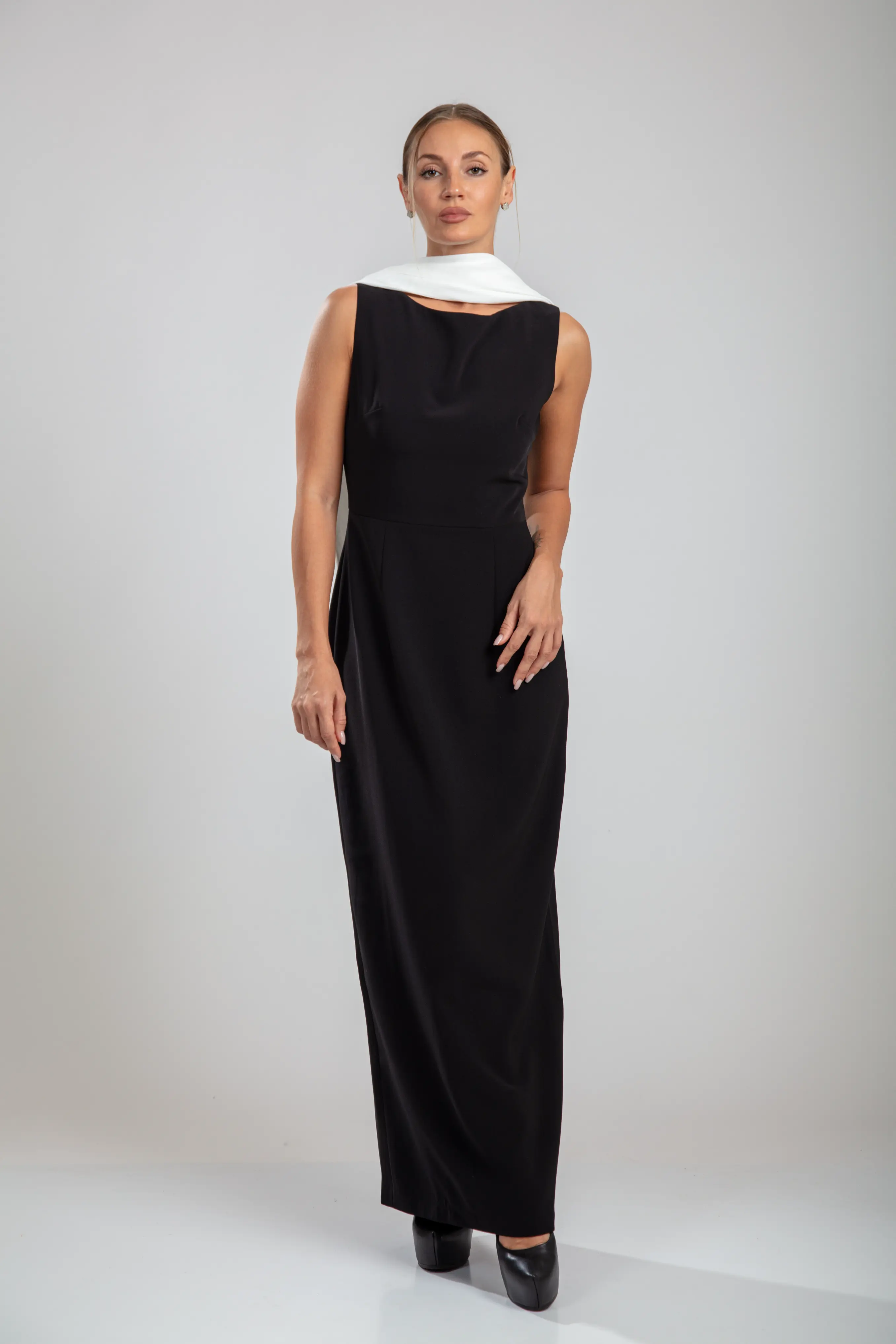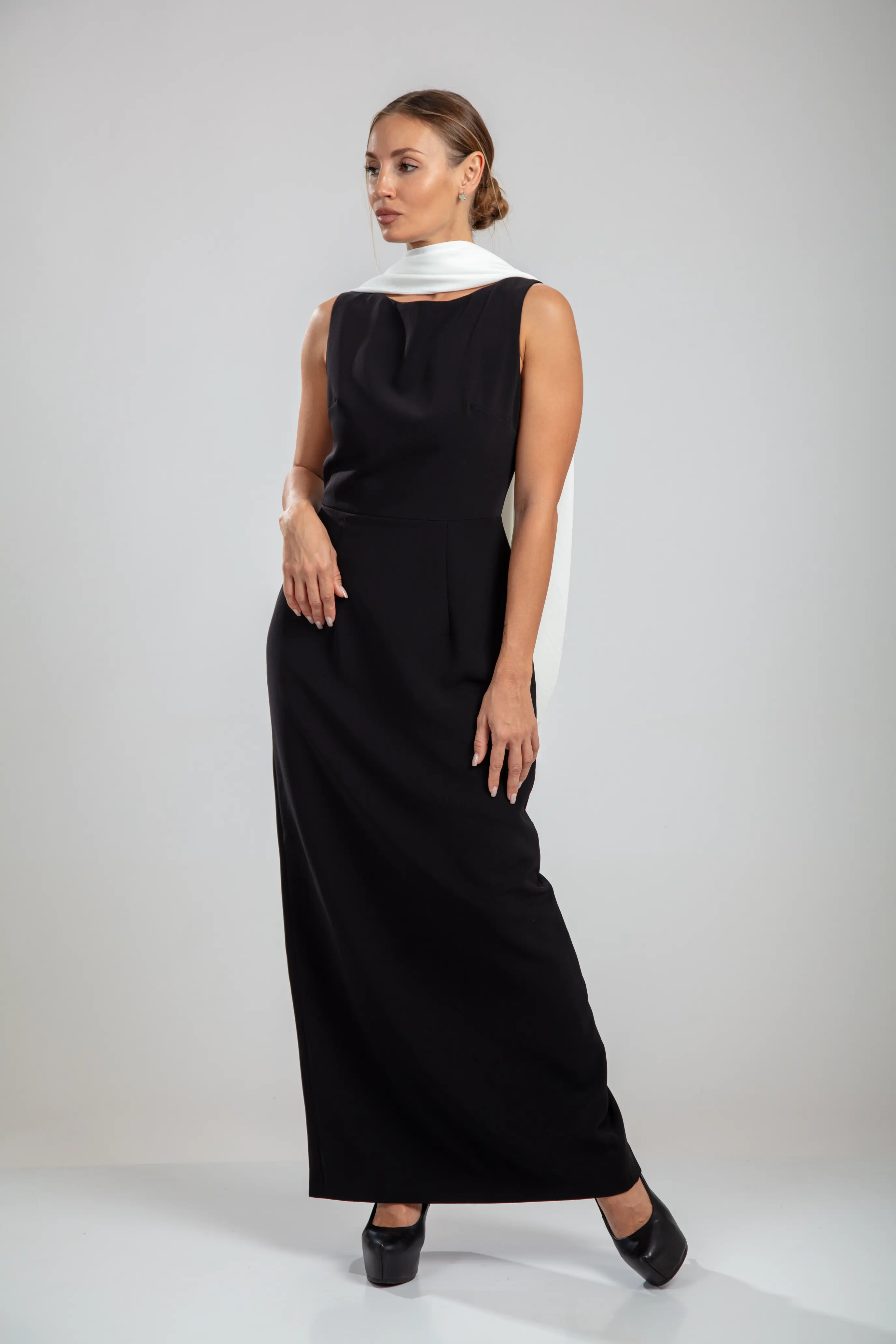 Command the room with the Noctyra Gown, a sleek black column silhouette punctuated by a luminous white draped scarf that frames the neckline and trails with fluid grace. The gown’s tailored bodice and floor-length cut elongate the body, while the scarf detail creates sculptural contrast—darkness and light entwined in one look.