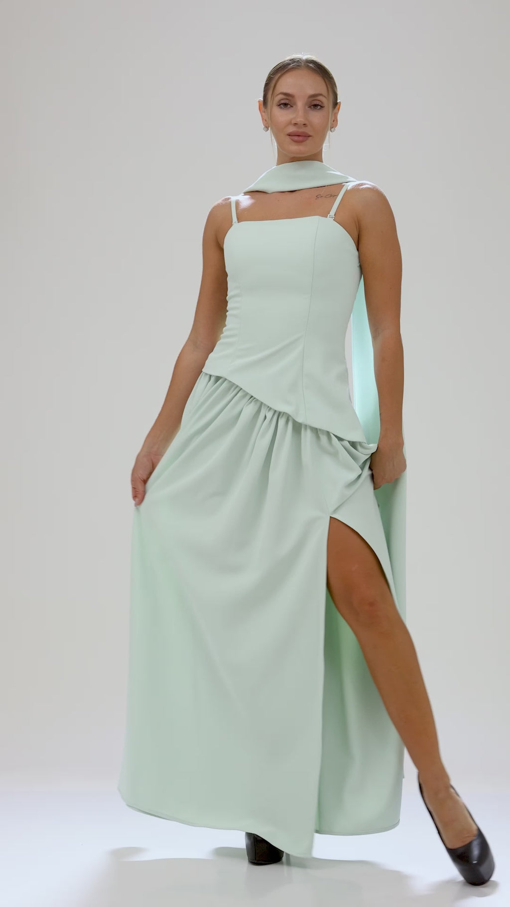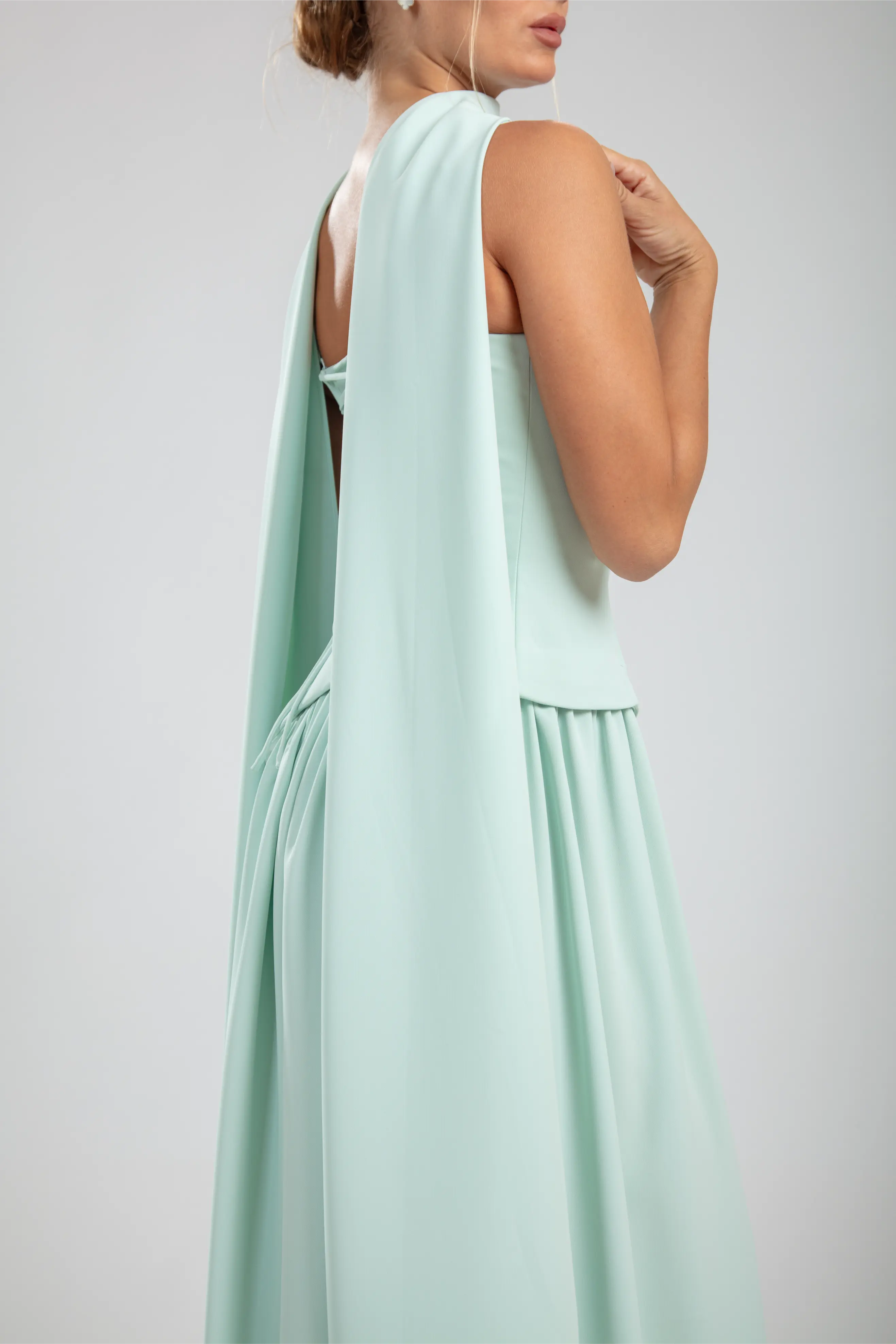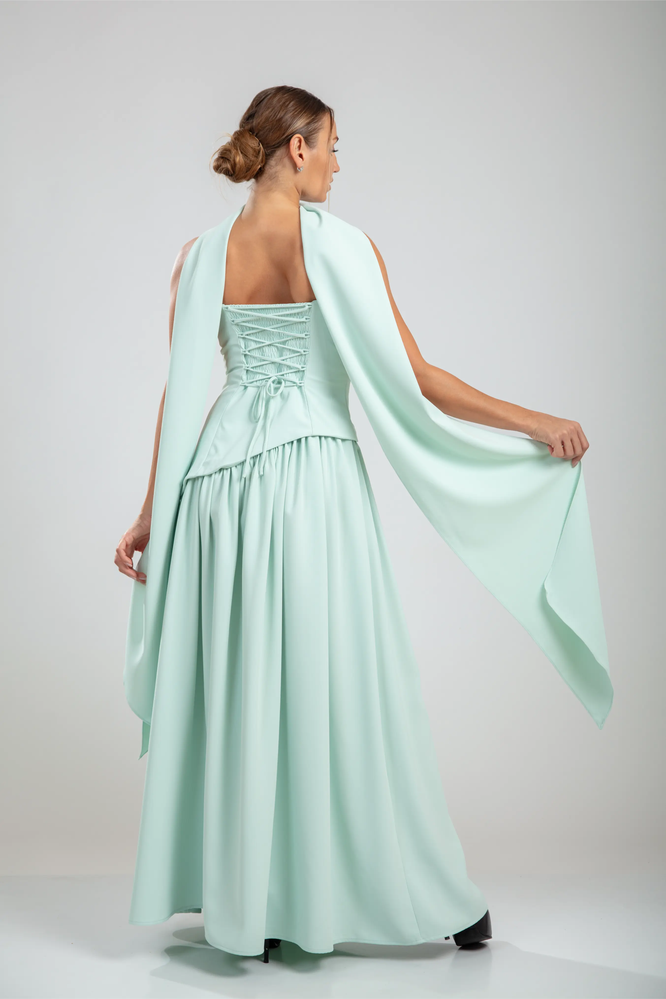 The Seraphine Gown transforms softness into power. Crafted in mint diagonal crepe, its strapless bodice cinches with asymmetric corset lines that sculpt the waist. A flowing full-length skirt cascades with airy volume, while the draped scarf detail adds a whisper of elegance. The lace-up back enhances adjustability, balancing structure with romance.
