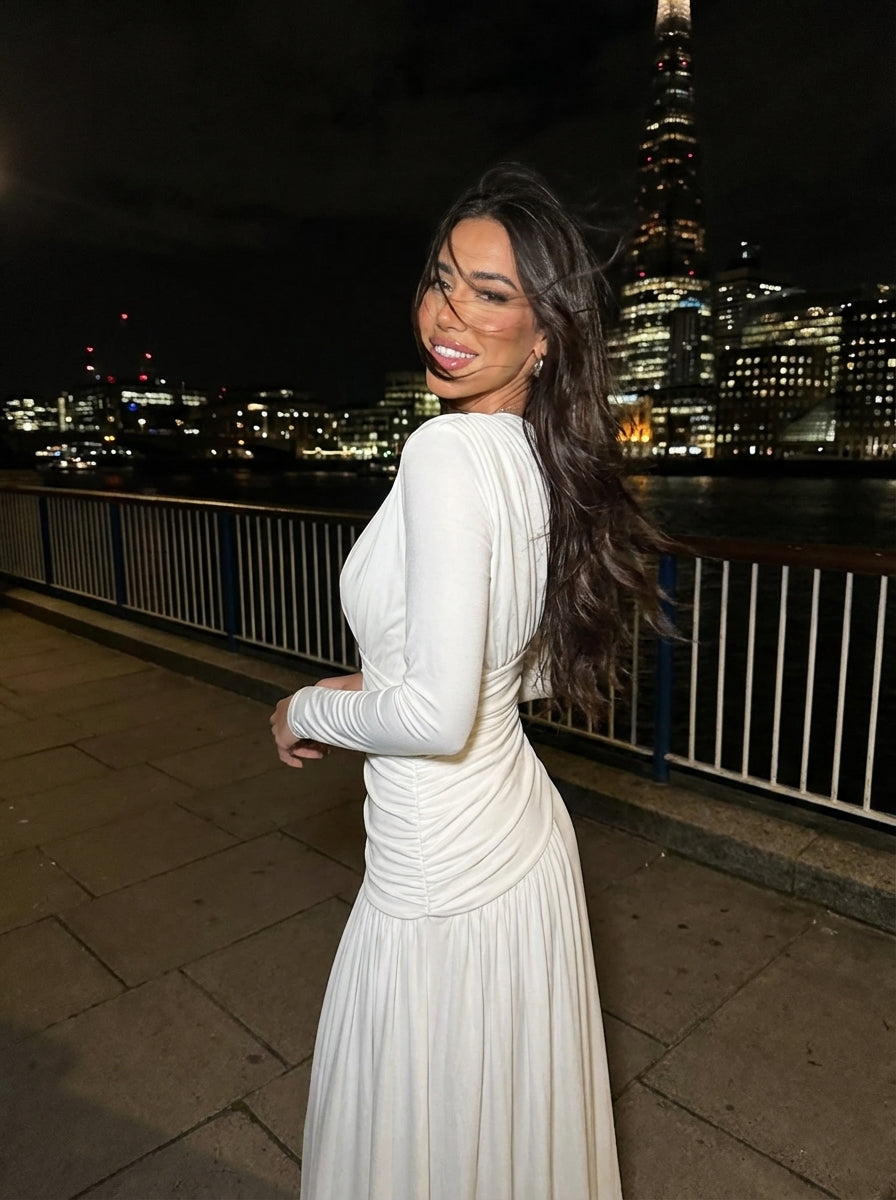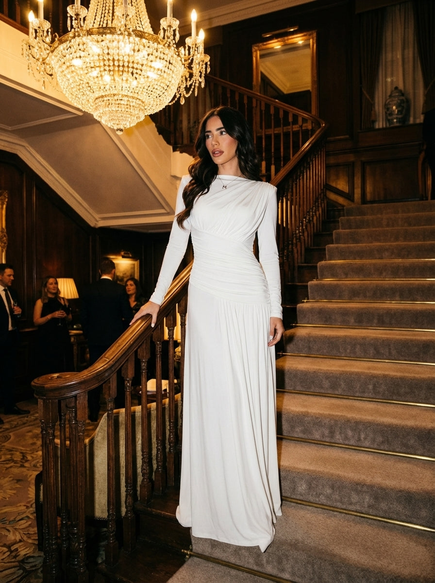 This long sleeve ivory gown features an elevated high neckline that frames the collarbone with quiet strength, while precision-engineered diagonal ruching cinches the waist and sculpts the torso. The asymmetric gathered waistline flows into a soft, floor-length skirt that moves with liquid grace, creating elongation and statuesque elegance from every angle.