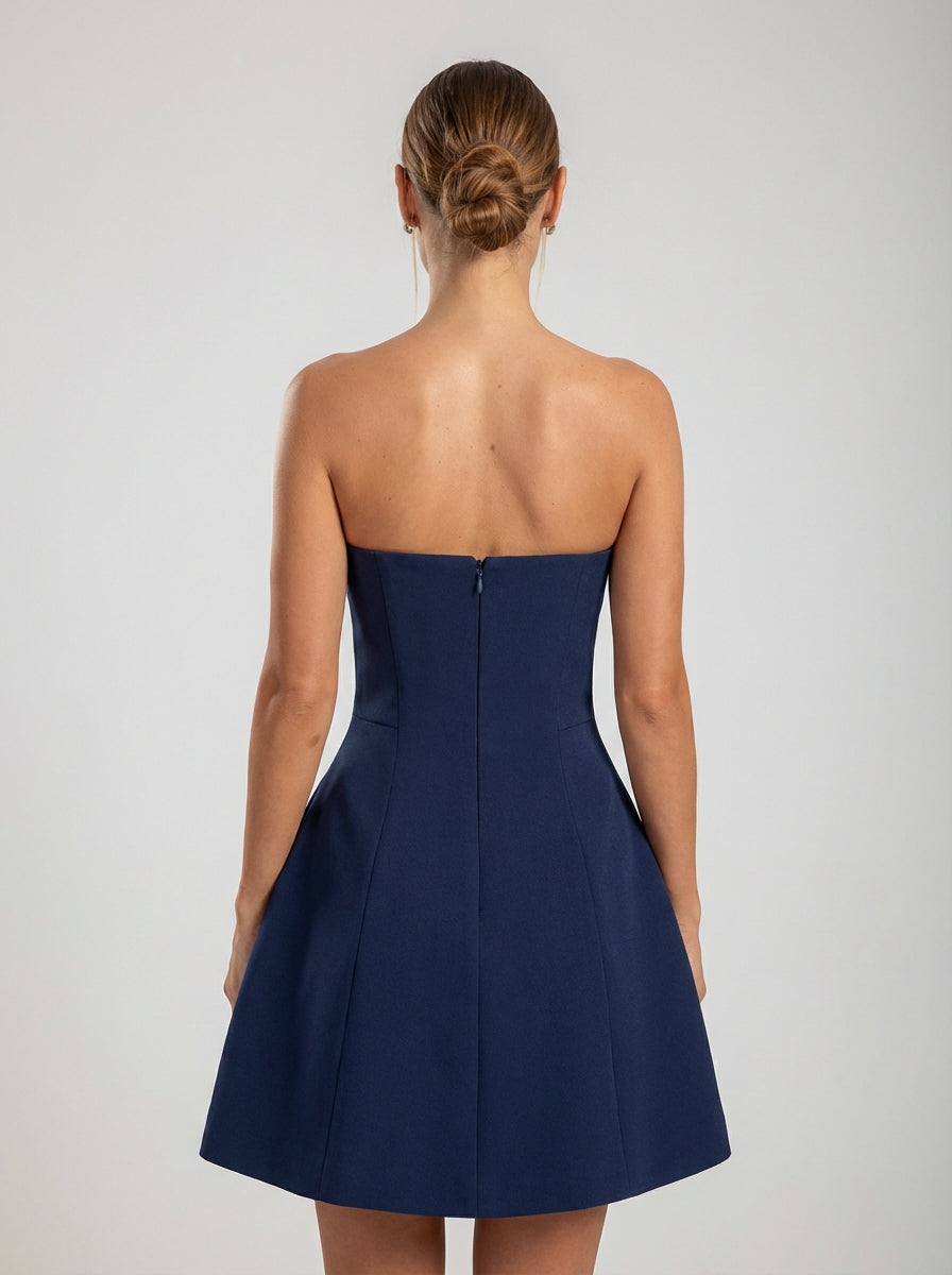 שמלת מיני כחולה כחולה ללא כתפיות עם מחוך מעוצב וגזרה מובנית. מעודנת ומודרנית.