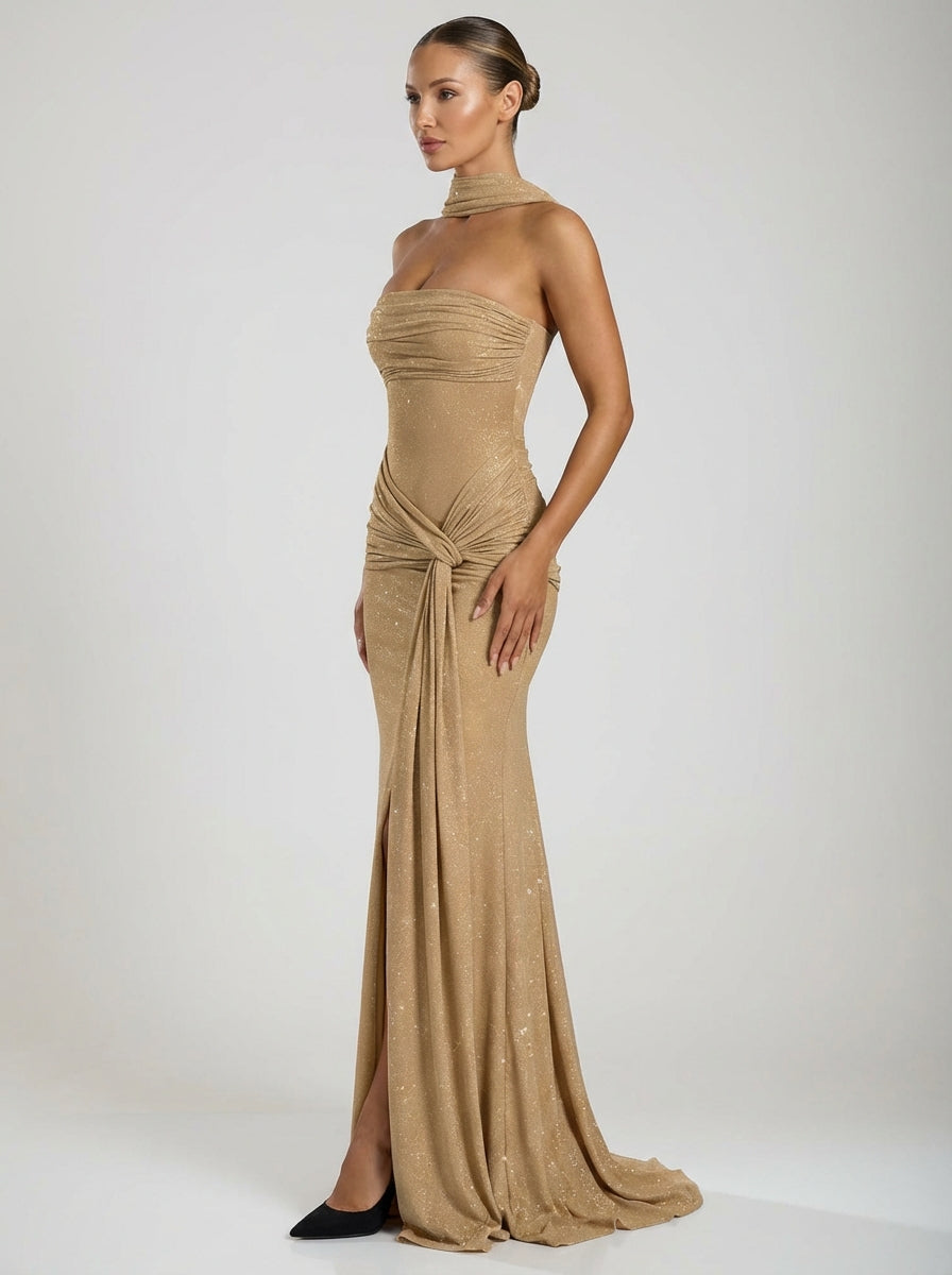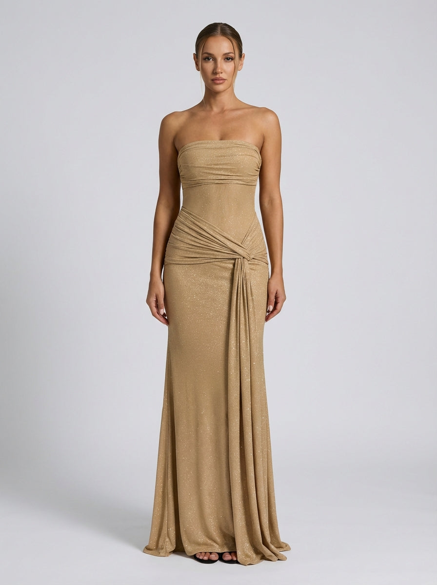 Gold sparkle strapless gown with sheer waist, draped wrap detail, and flowing floor-length skirt.