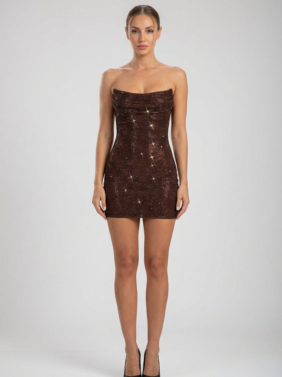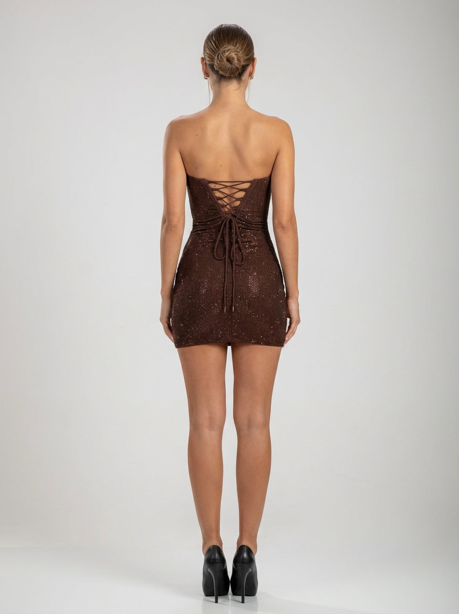 brown sparkle strapless mini dress with corset bodice and lace-up back. Sculpted, glamorous, and statement-ready.