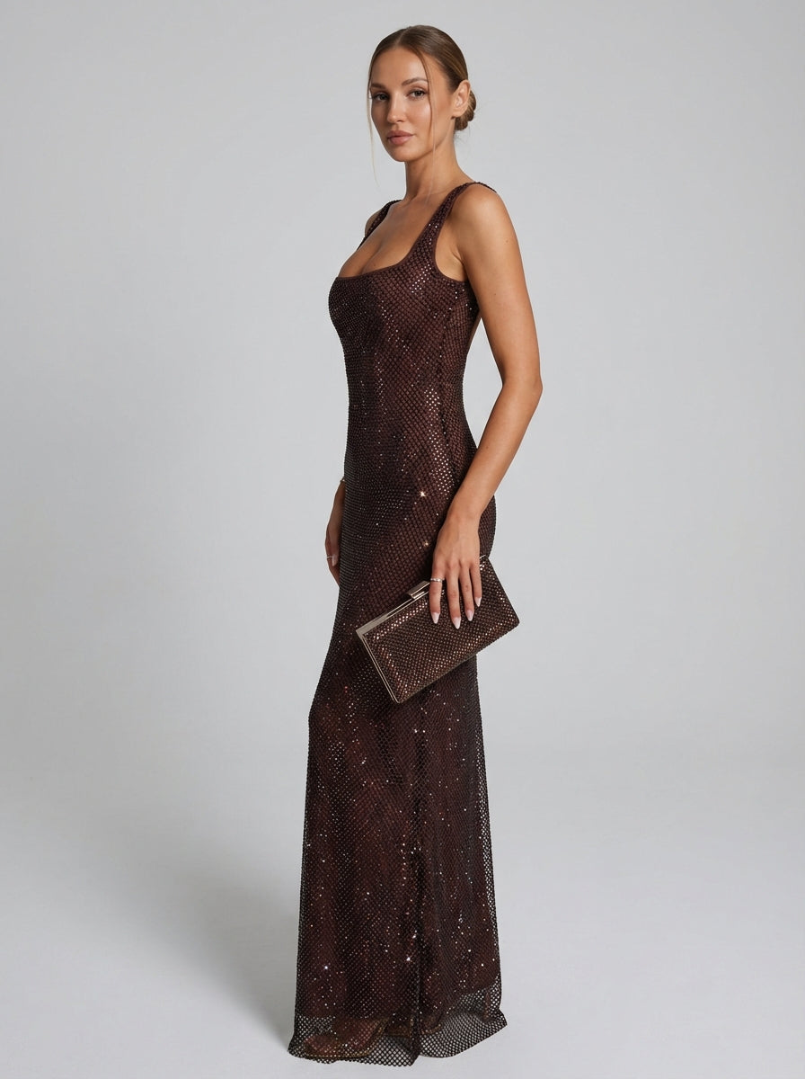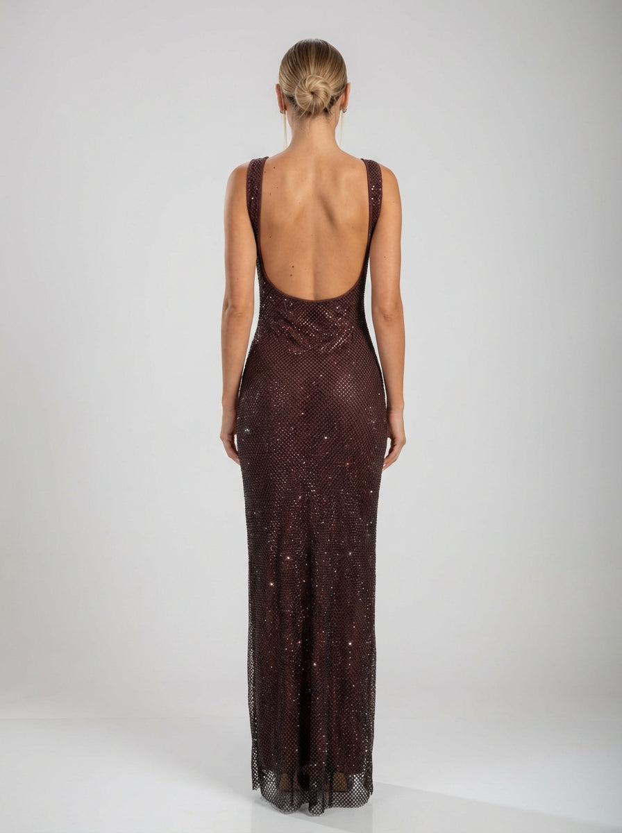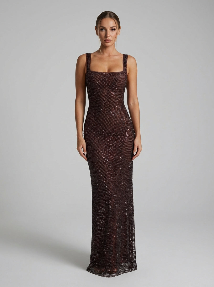 Nocturne Crystal Mesh Gown is a sheer brown floor-length dress with all-over crystal detailing and a sculpted, body-contouring fit.
