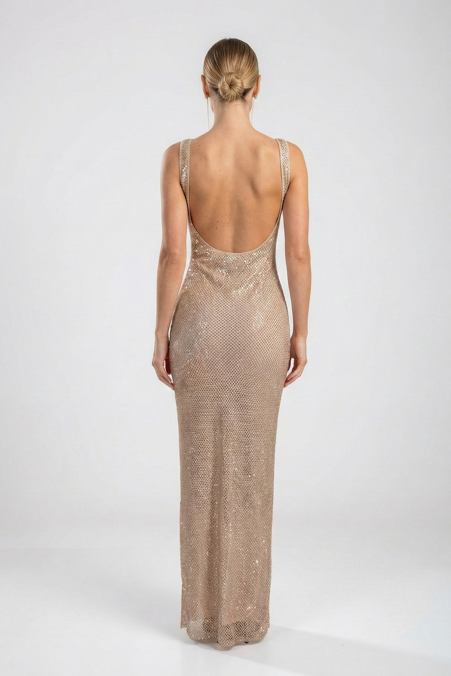Nocturne Crystal Mesh Gown is a sheer champagne floor-length dress with all-over crystal detailing and a sculpted, body-contouring fit.