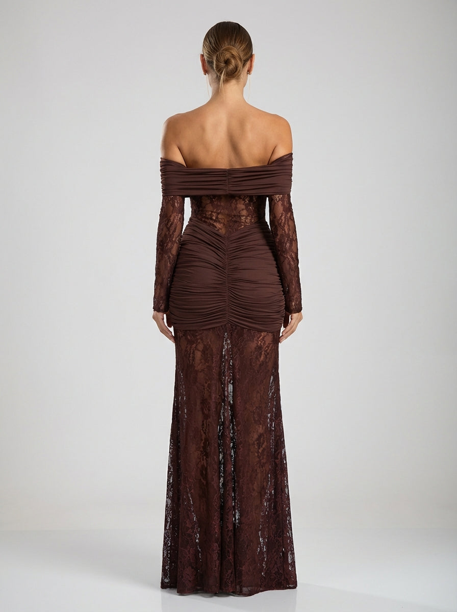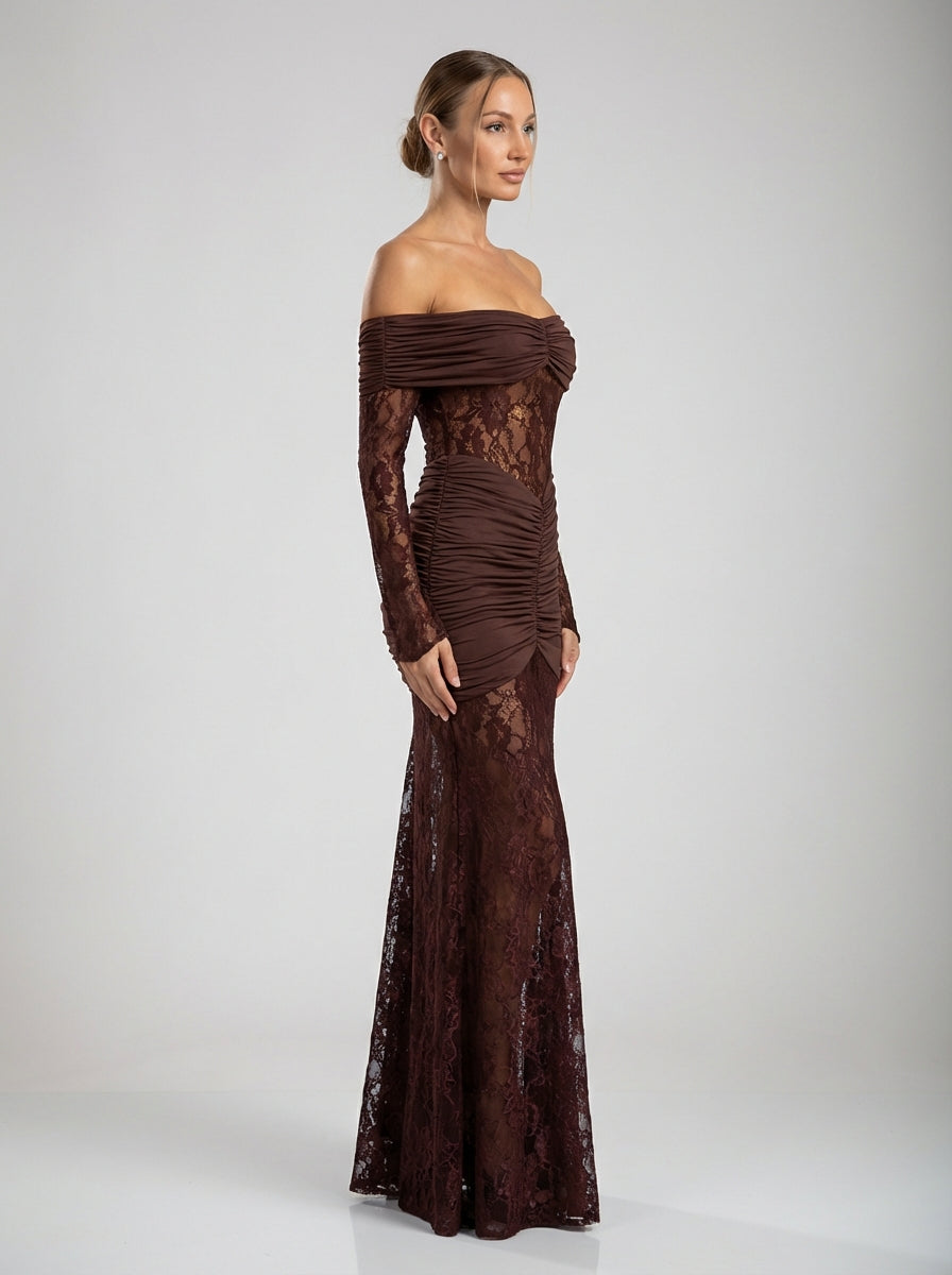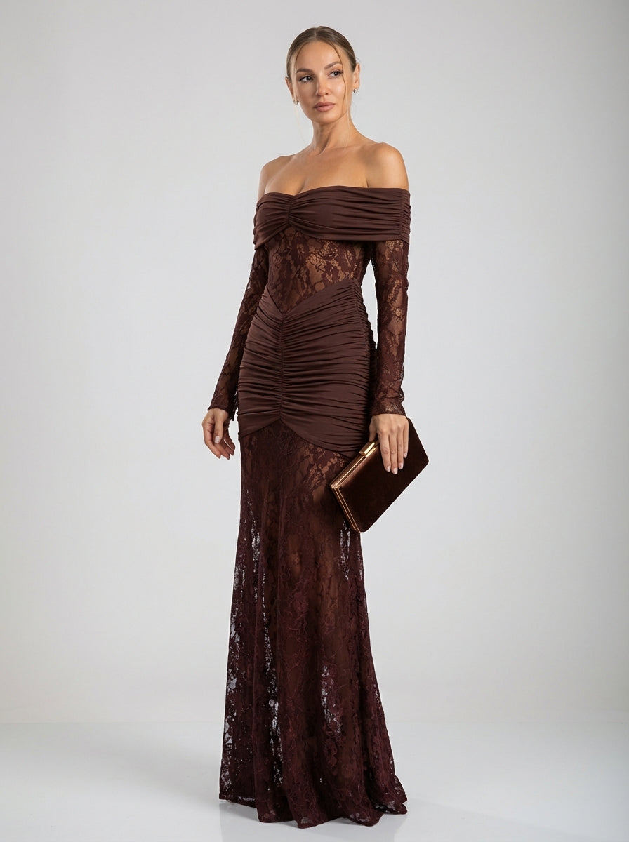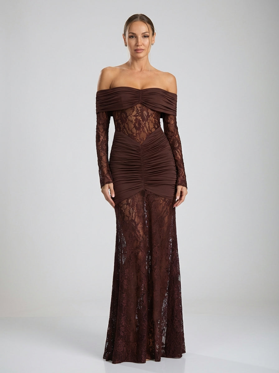 שמלות תחרה וולנסיה עם כתפיים חשופות - חום שזיף