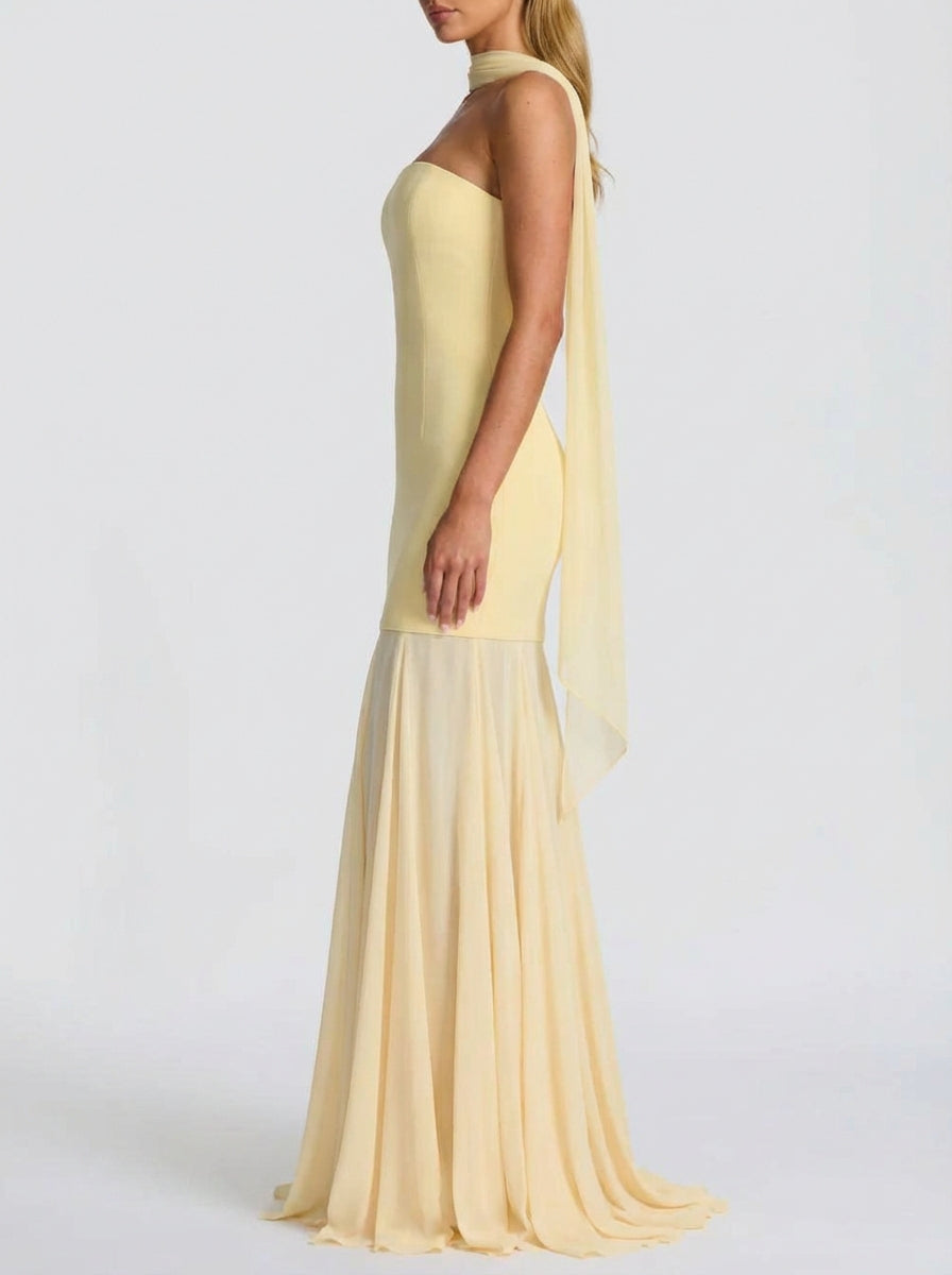 Lemon yellow strapless gown with sculpted satin bodice, chiffon skirt, and detachable scarf detail. Light and elegant.